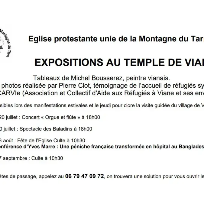 D’une part, ce sont les productions picturales de Michel Bousserez, peintre Vianais. D’autre part, une exposition photo réalisée par Pierre Clot témoigne de l'accueil de réfugiés syriens.