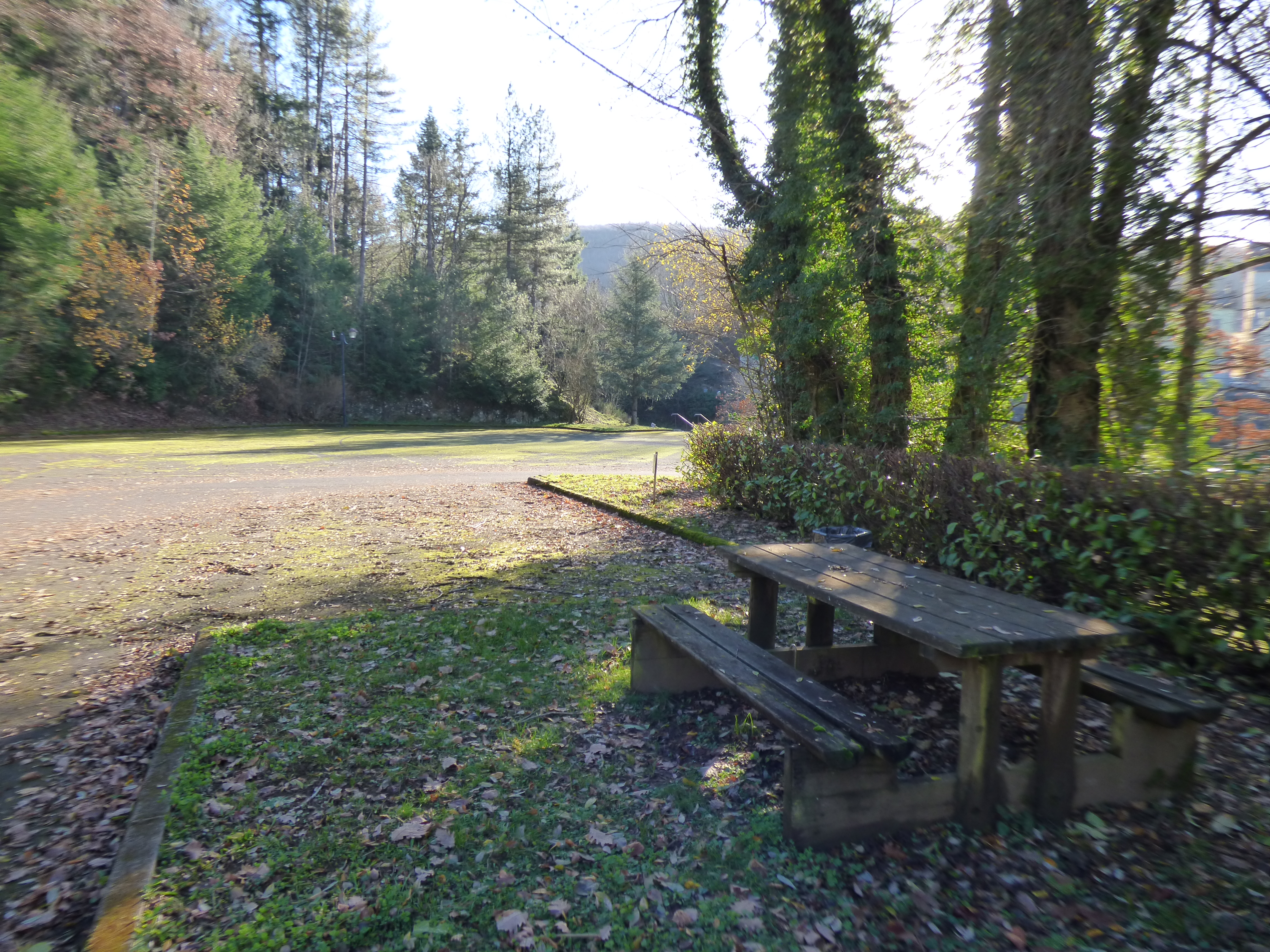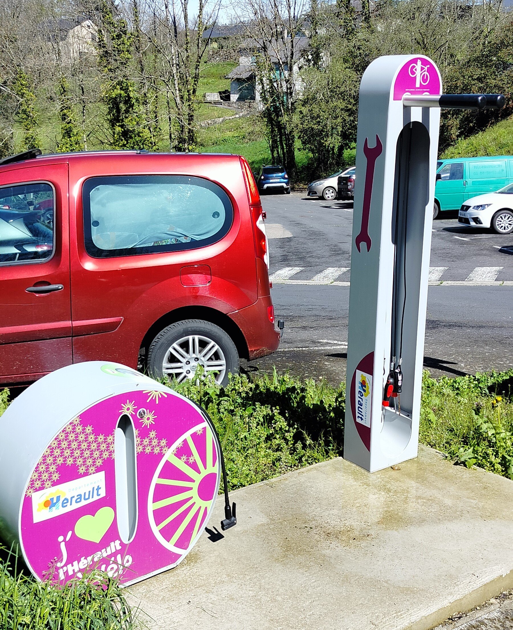 Petite aire ombragée située sur un parking. Kit dépannage vélo à proximité.