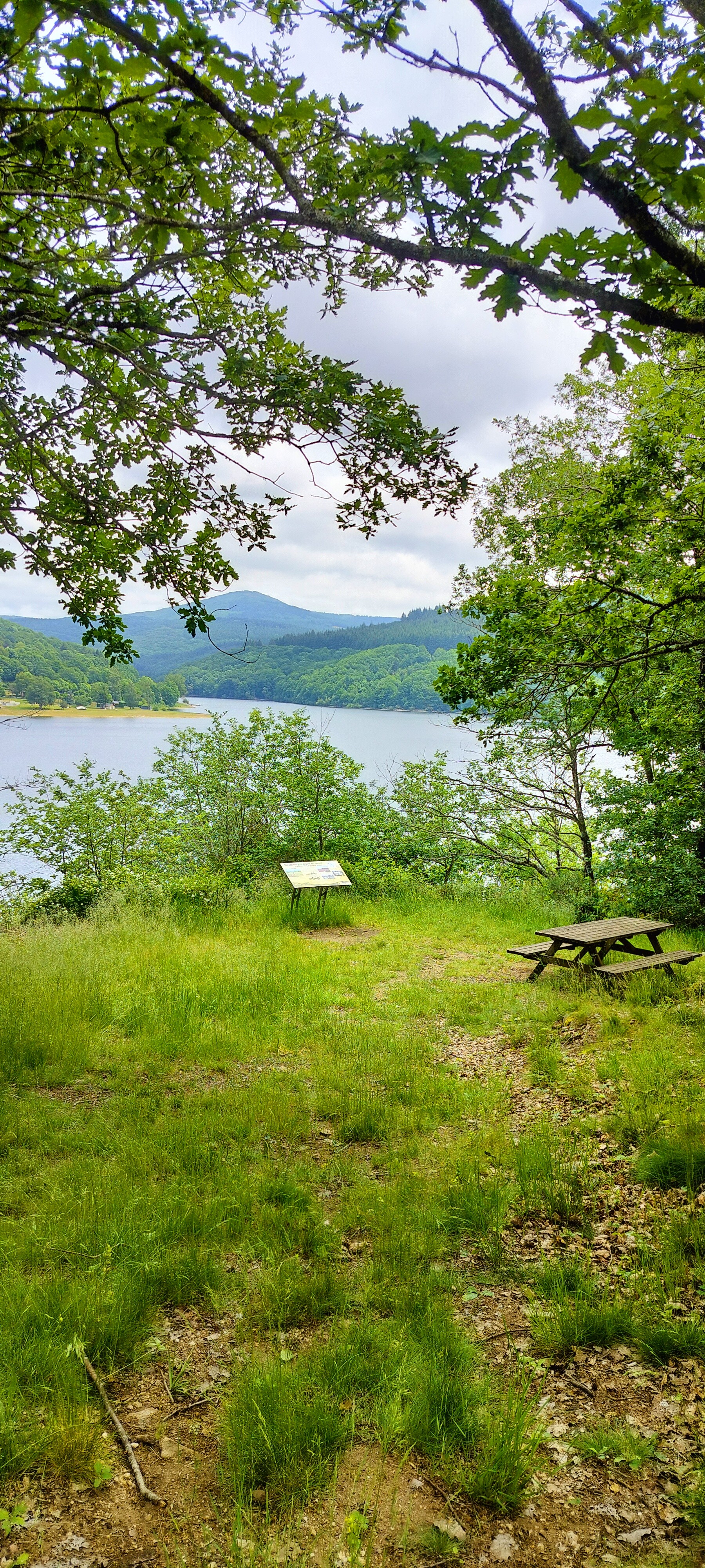 Halte sur le chemin de randonnée "La Presqu'île de Belbespré" offrant une magnifique vue sur le lac du Laouzas.