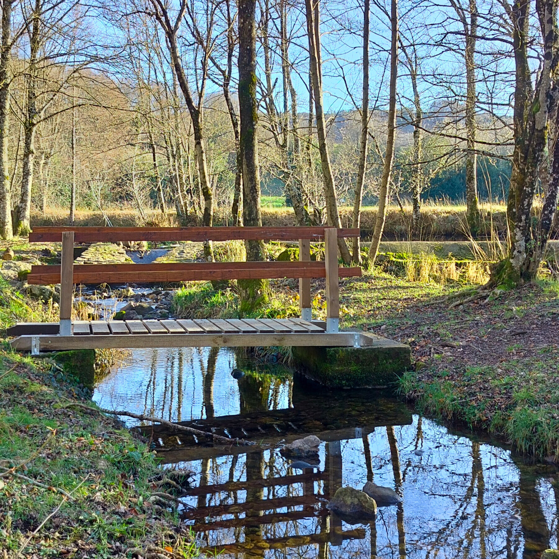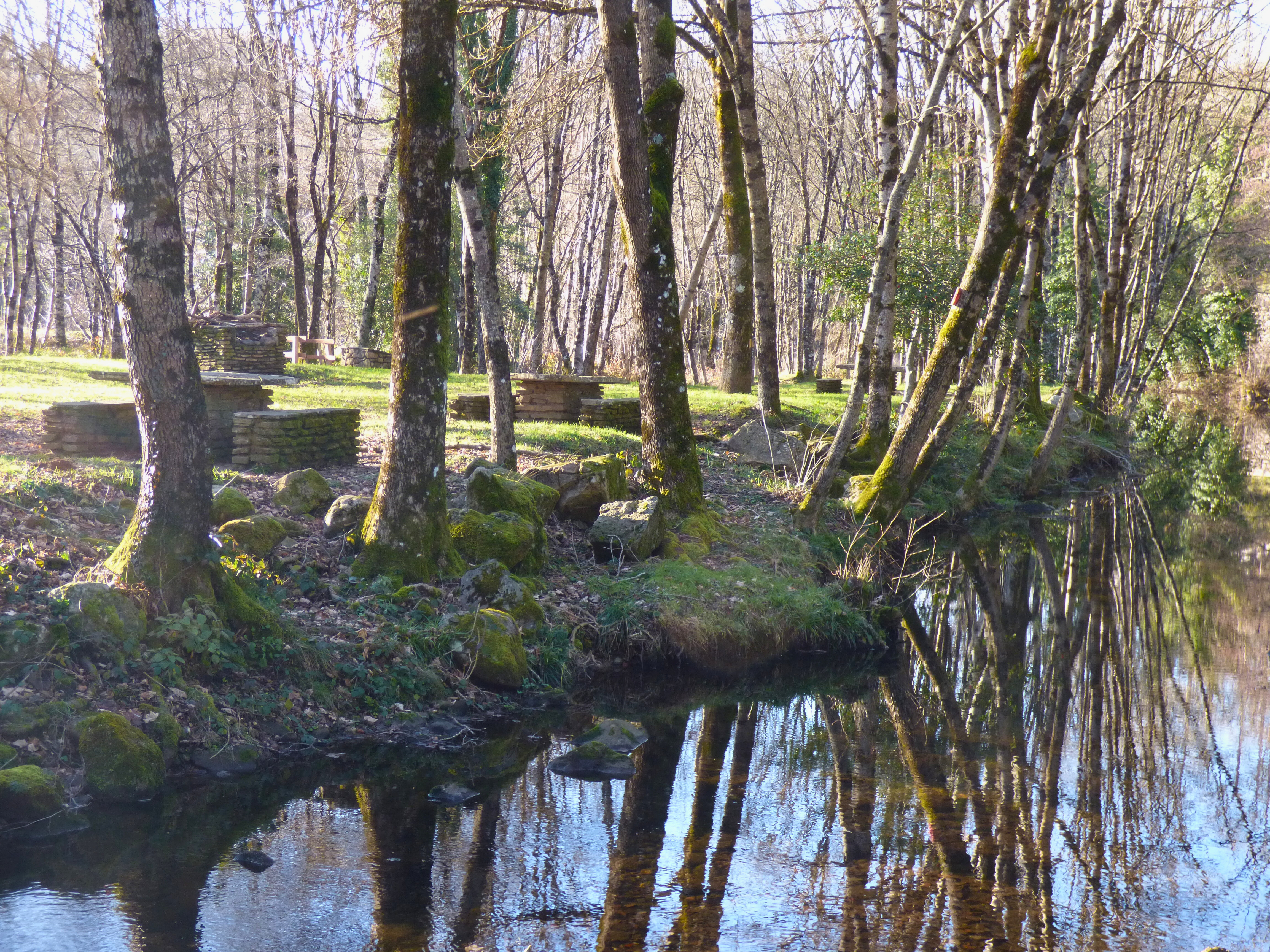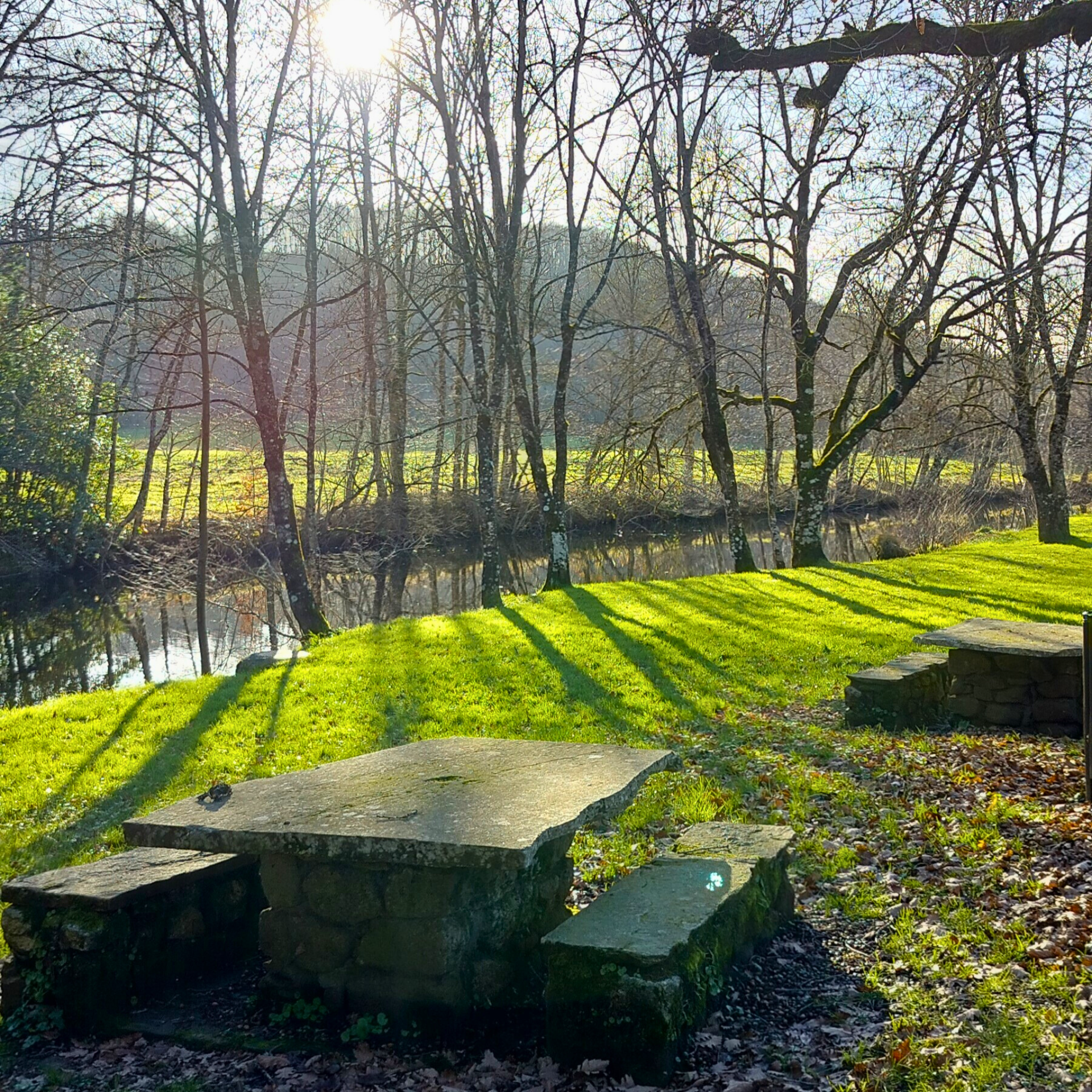 Aire ombragée en bordure de rivière, ideale pour la pêche et équipée d'un barbecue.