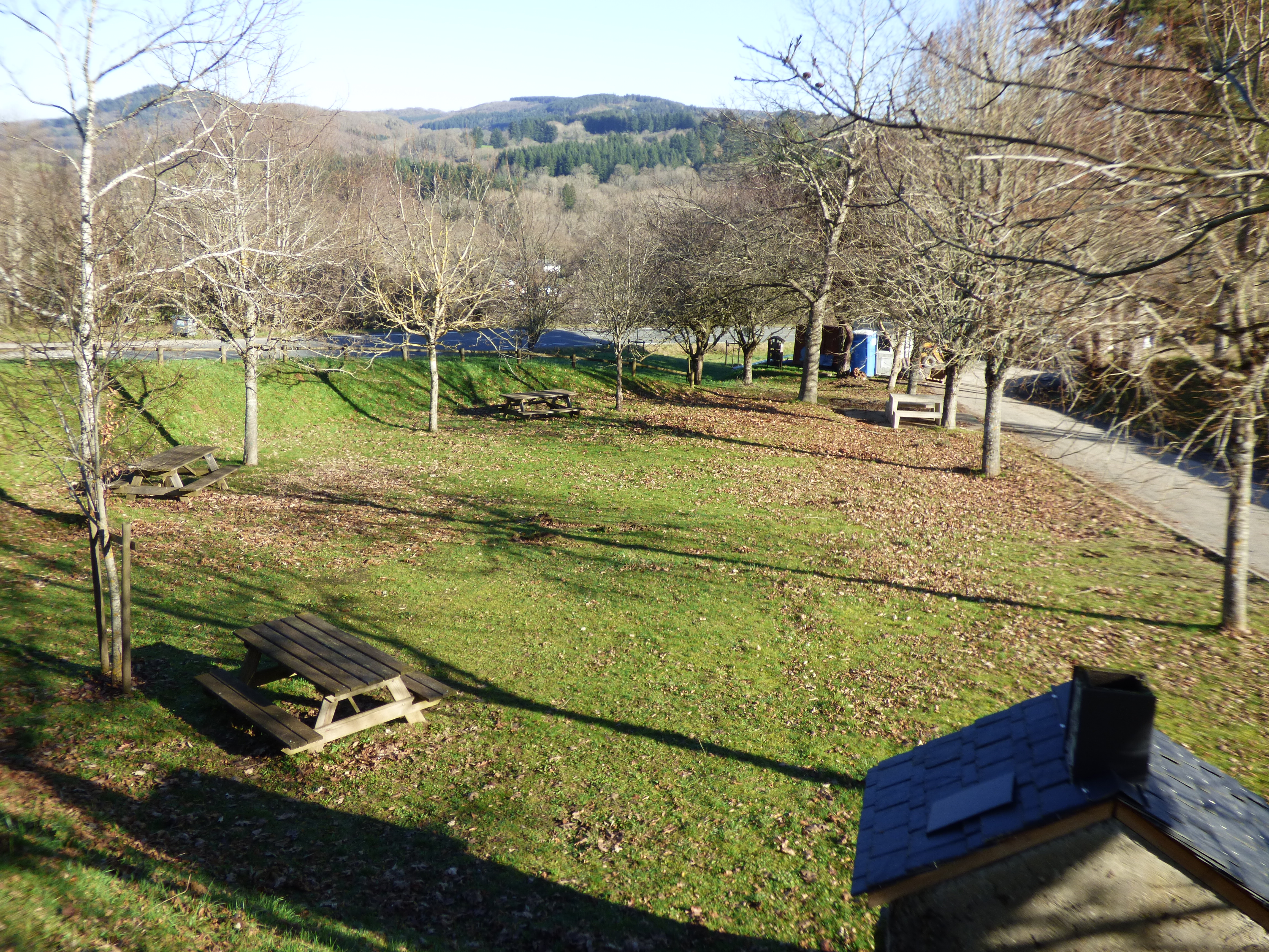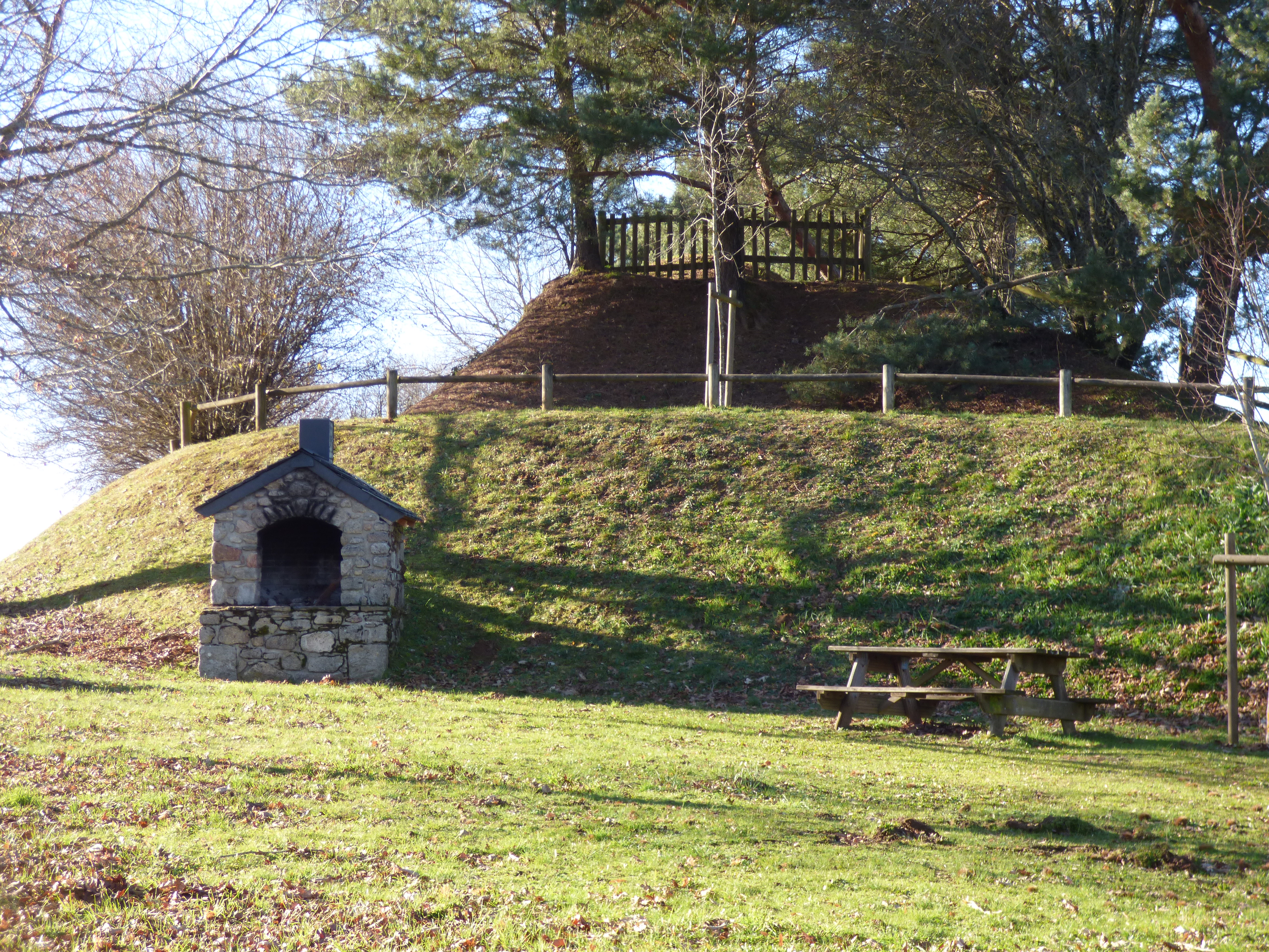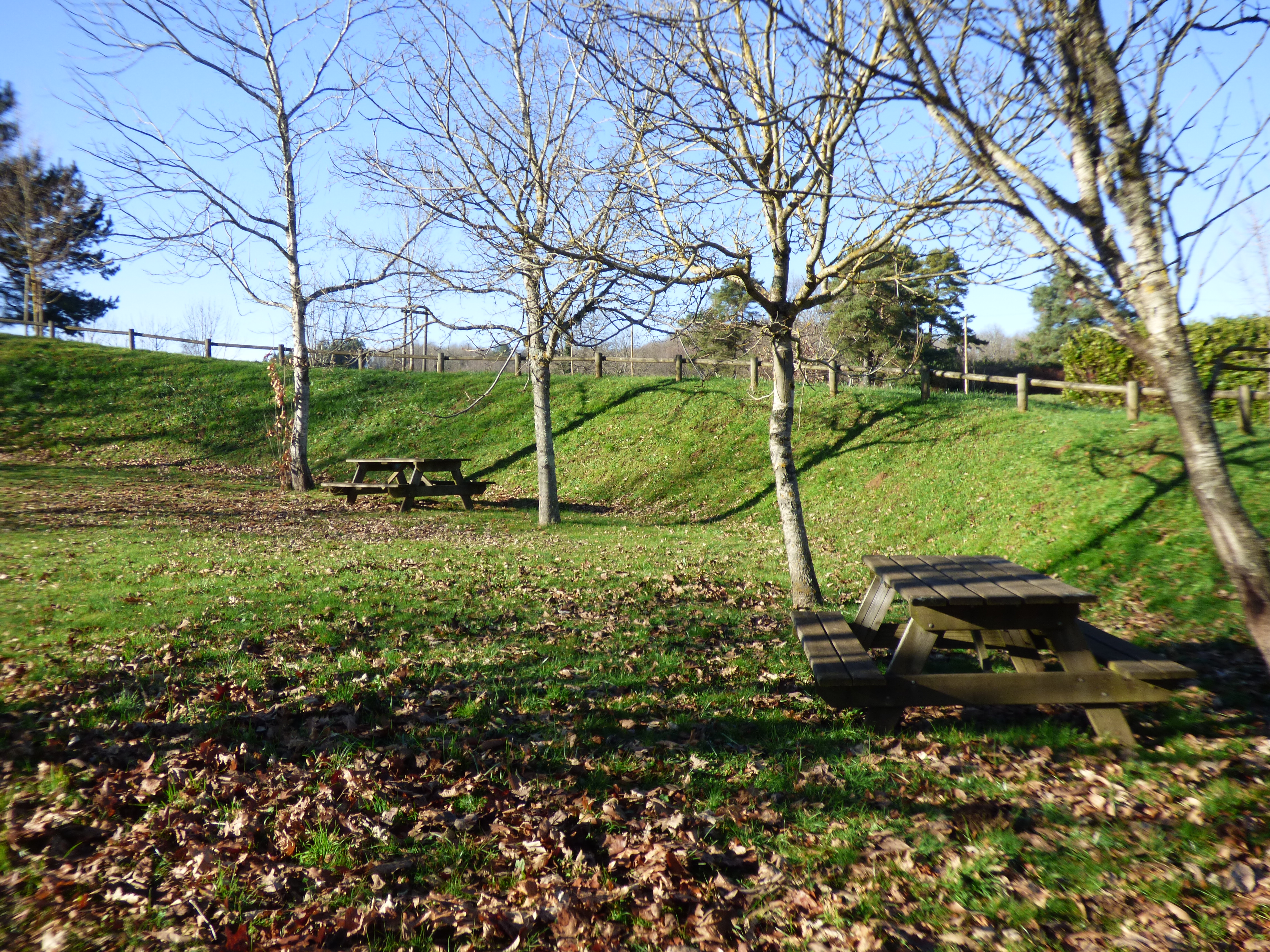 Aire ombragée en retrait de la route, équipée d'un barbecue.