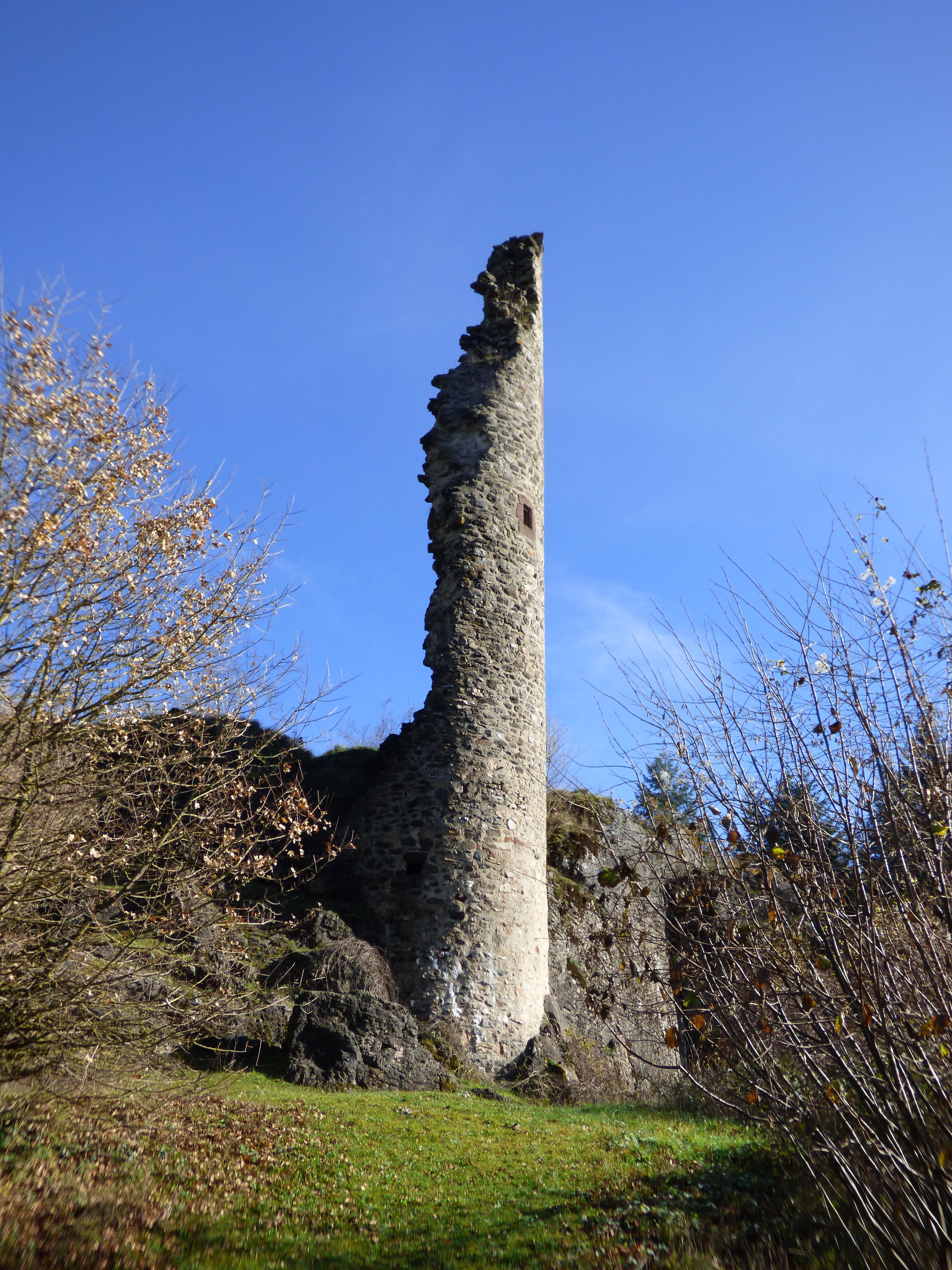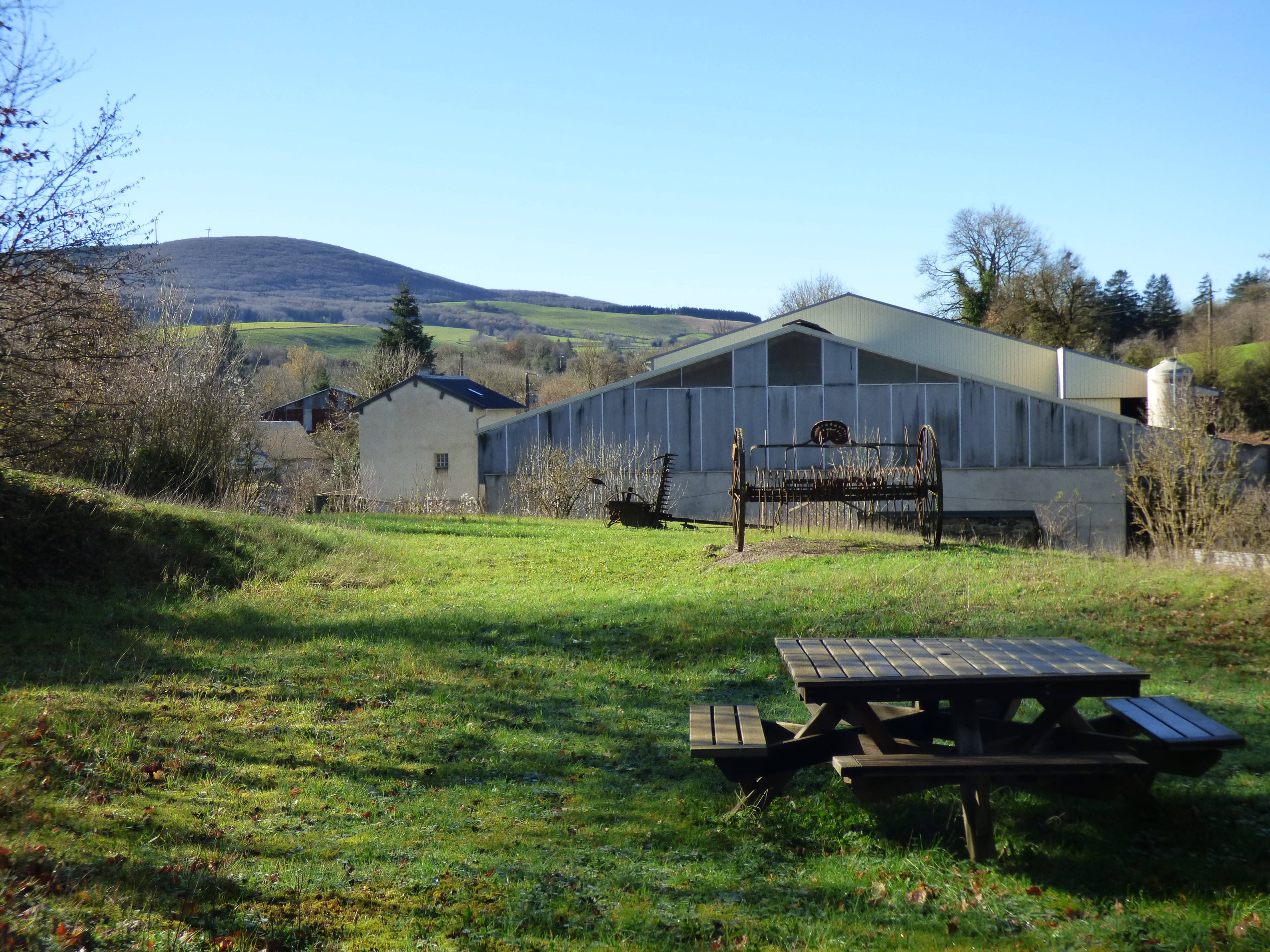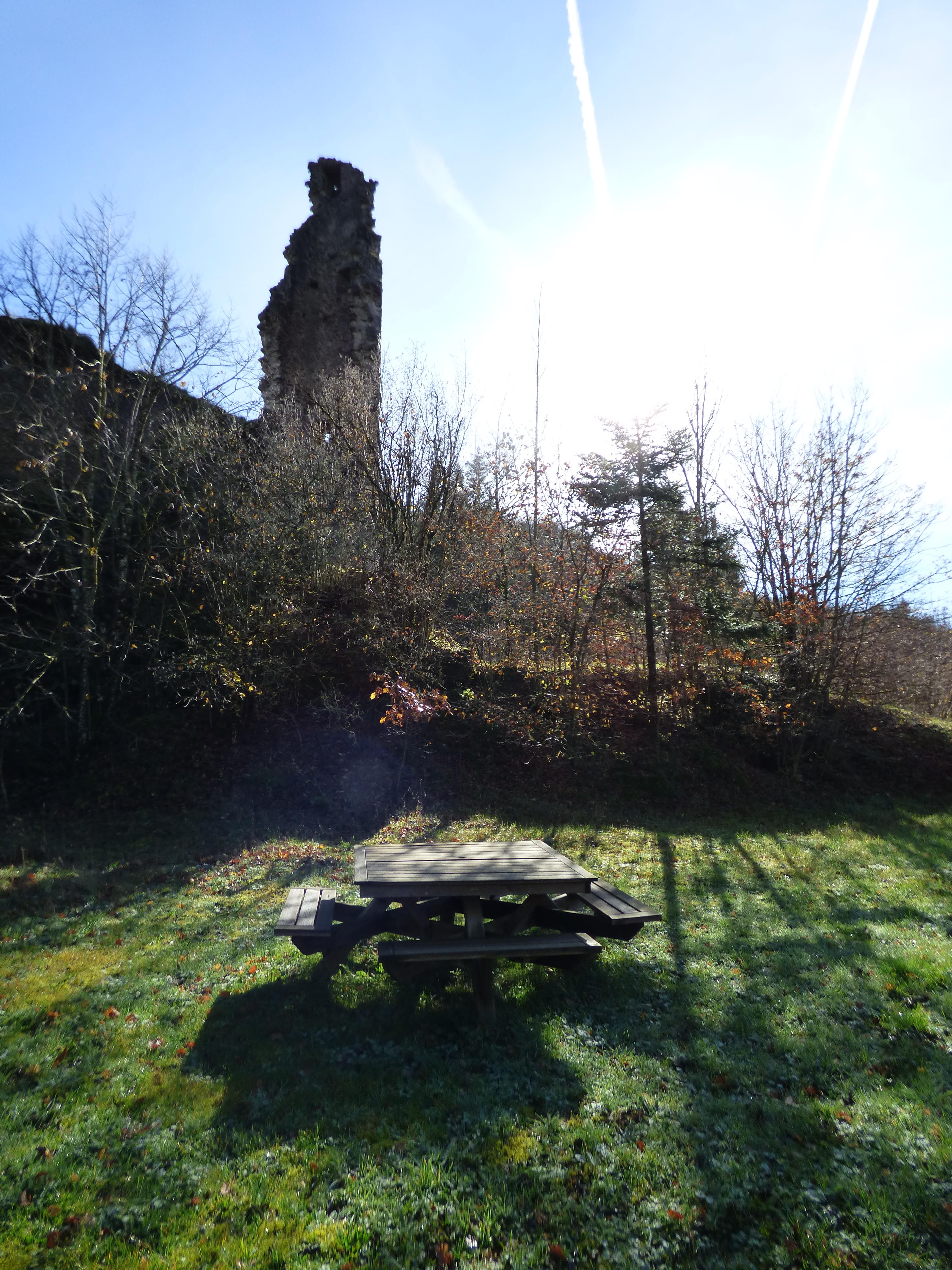 Aire ombragée avec vue sur la tour ruinée du château de Boissezon-de-Masviel et exposition d'anciens matériels agricoles. Sur place, panneau mentionnant l'histoire du château.