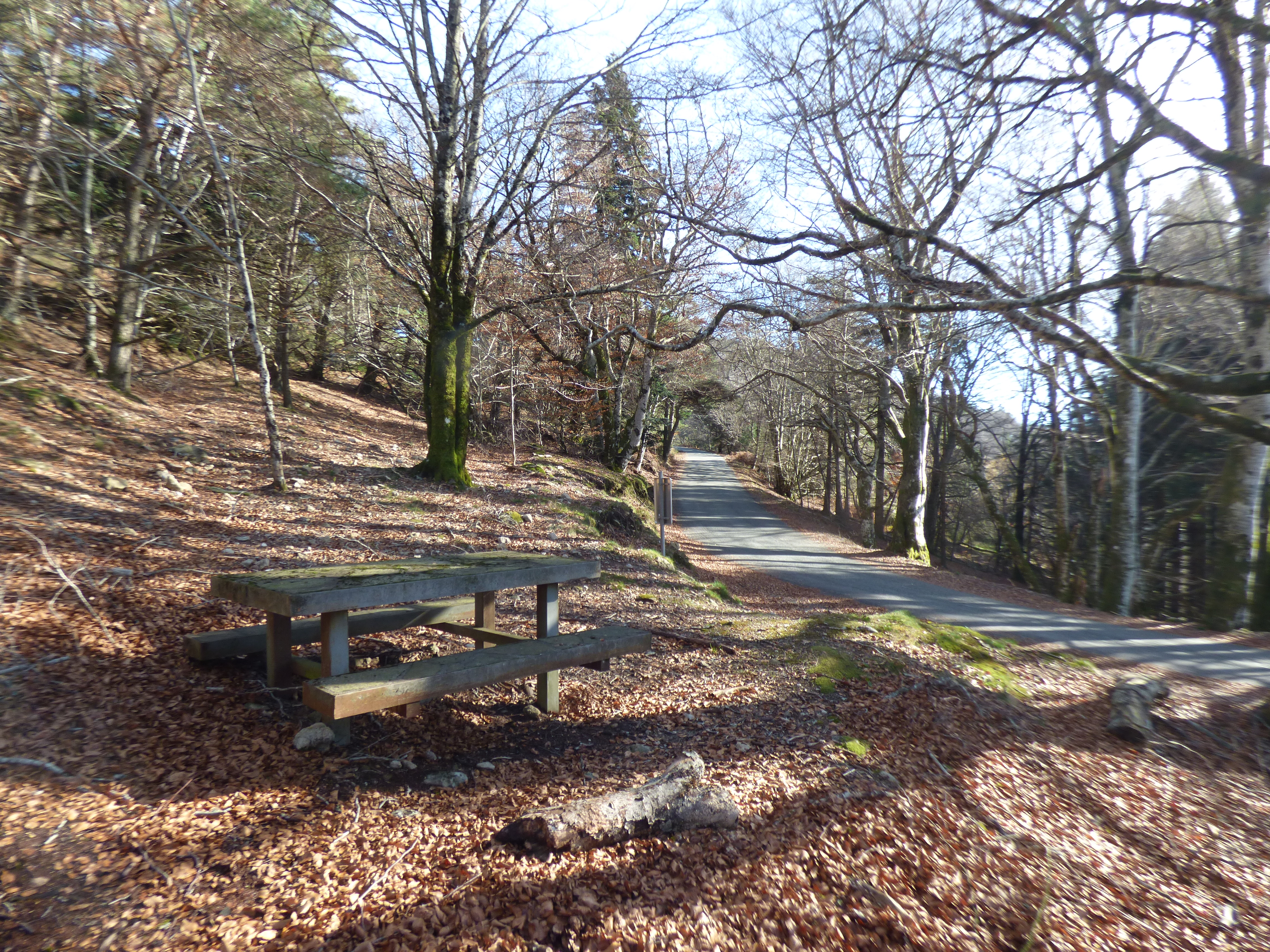 Petite aire ombragée proche d'un ruisseau et au bord d'une route offrant de magnifiques panoramas sur le massif du Caroux-Espinouse.