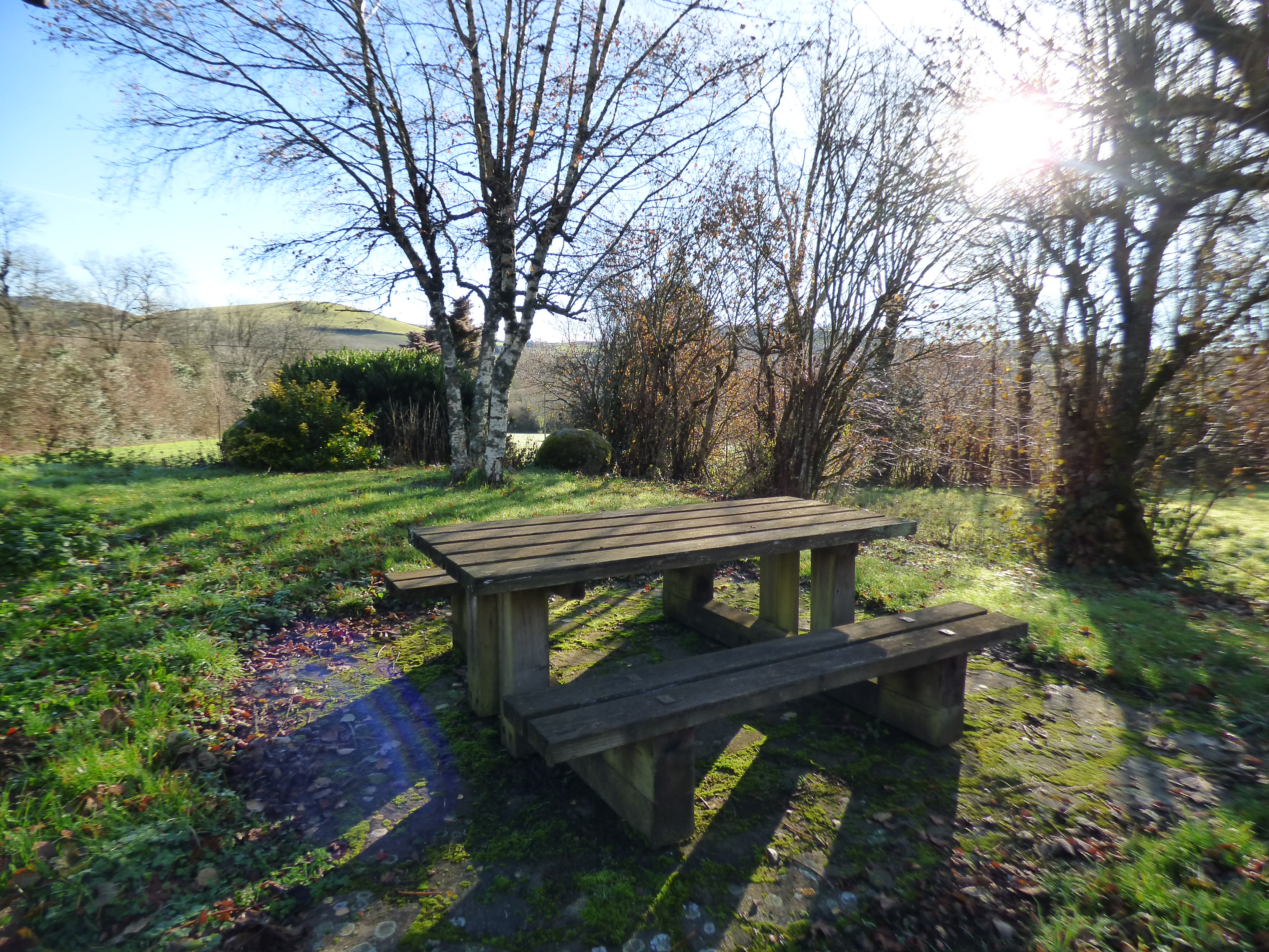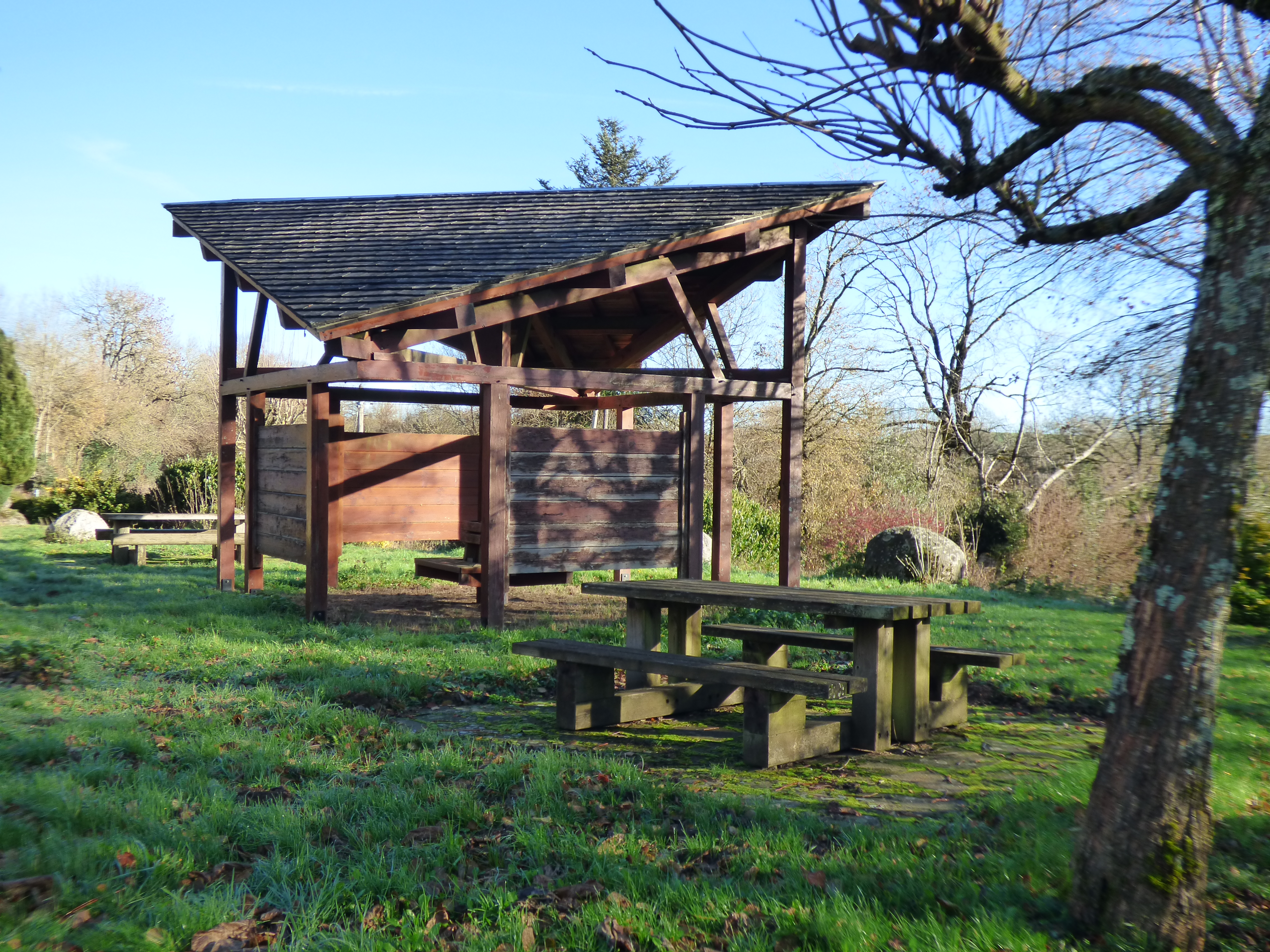 En bordure de route, aire équipée de deux tables, d'un préau avec bancs et d'une aire de stationnement.