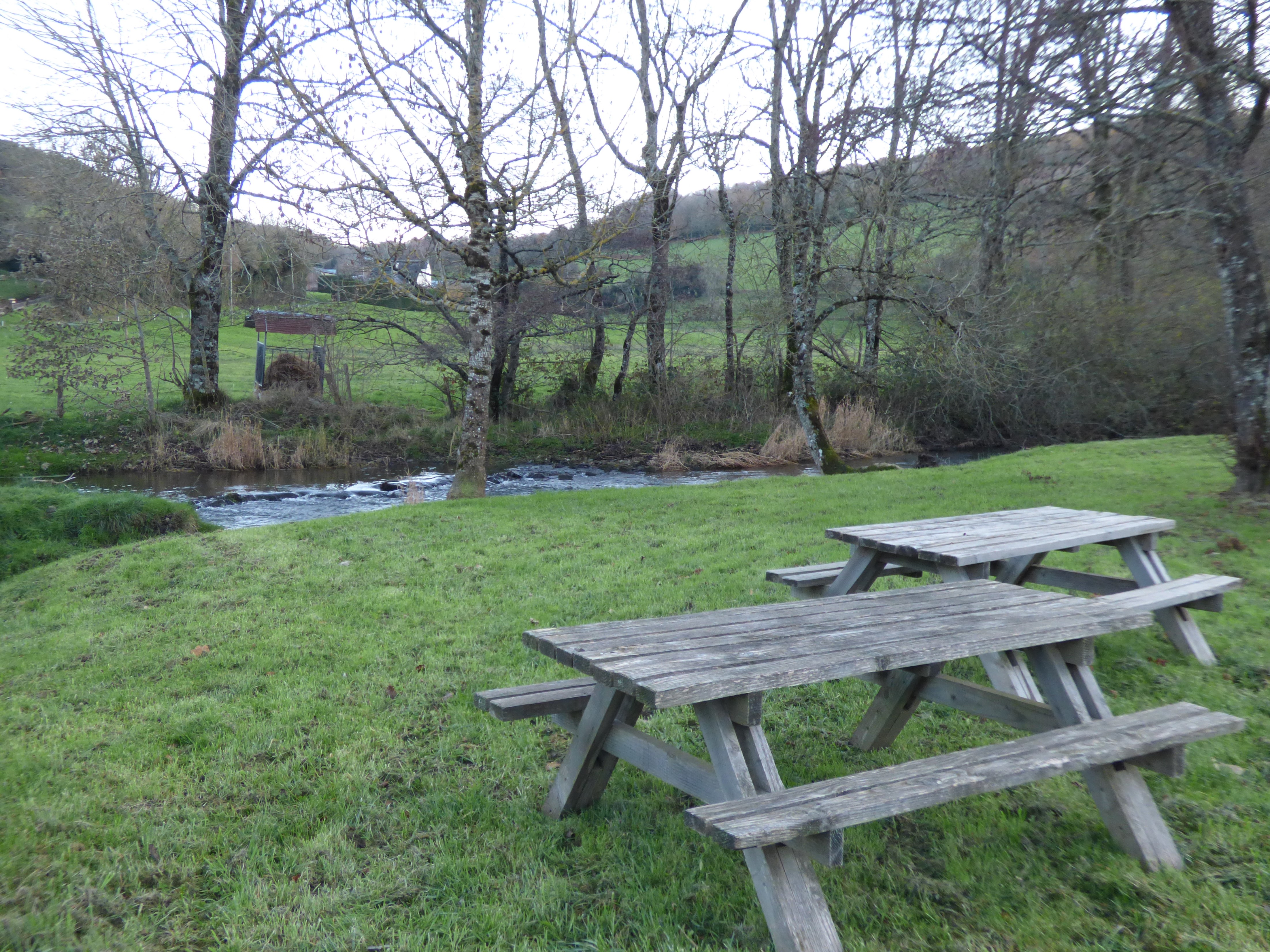Espace comprenant 3 tables sur un grand terrain en bord de rivière, idéal pêche. Parking à proximité muni d'une borne de recharge pour véhicules électriques. Barbecues et aire de jeu disponibles sur une aire proche, de l'autre côté de la route.
