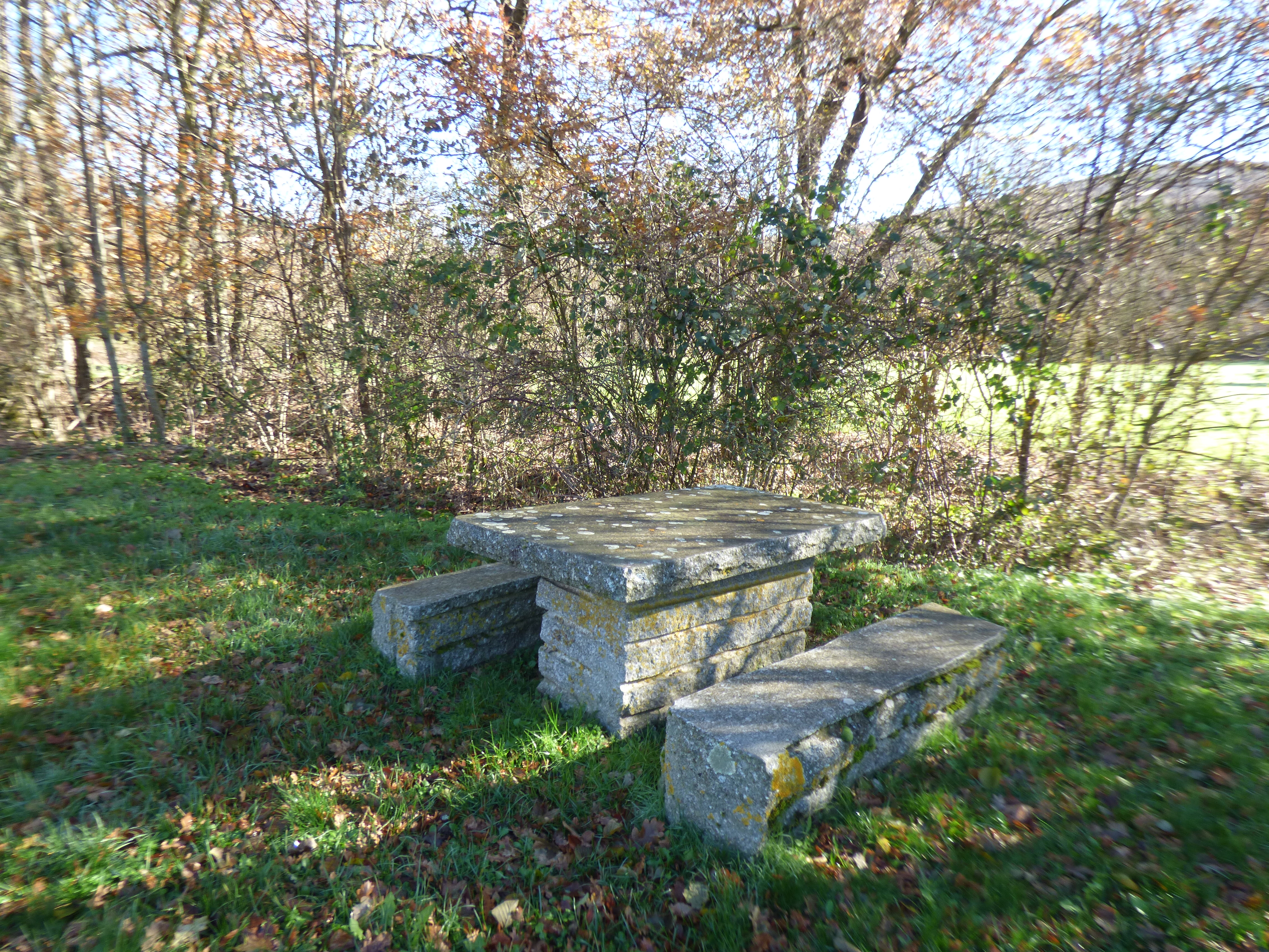 Petite aire ombragée en bord de route. Statue-menhir à proximité.
