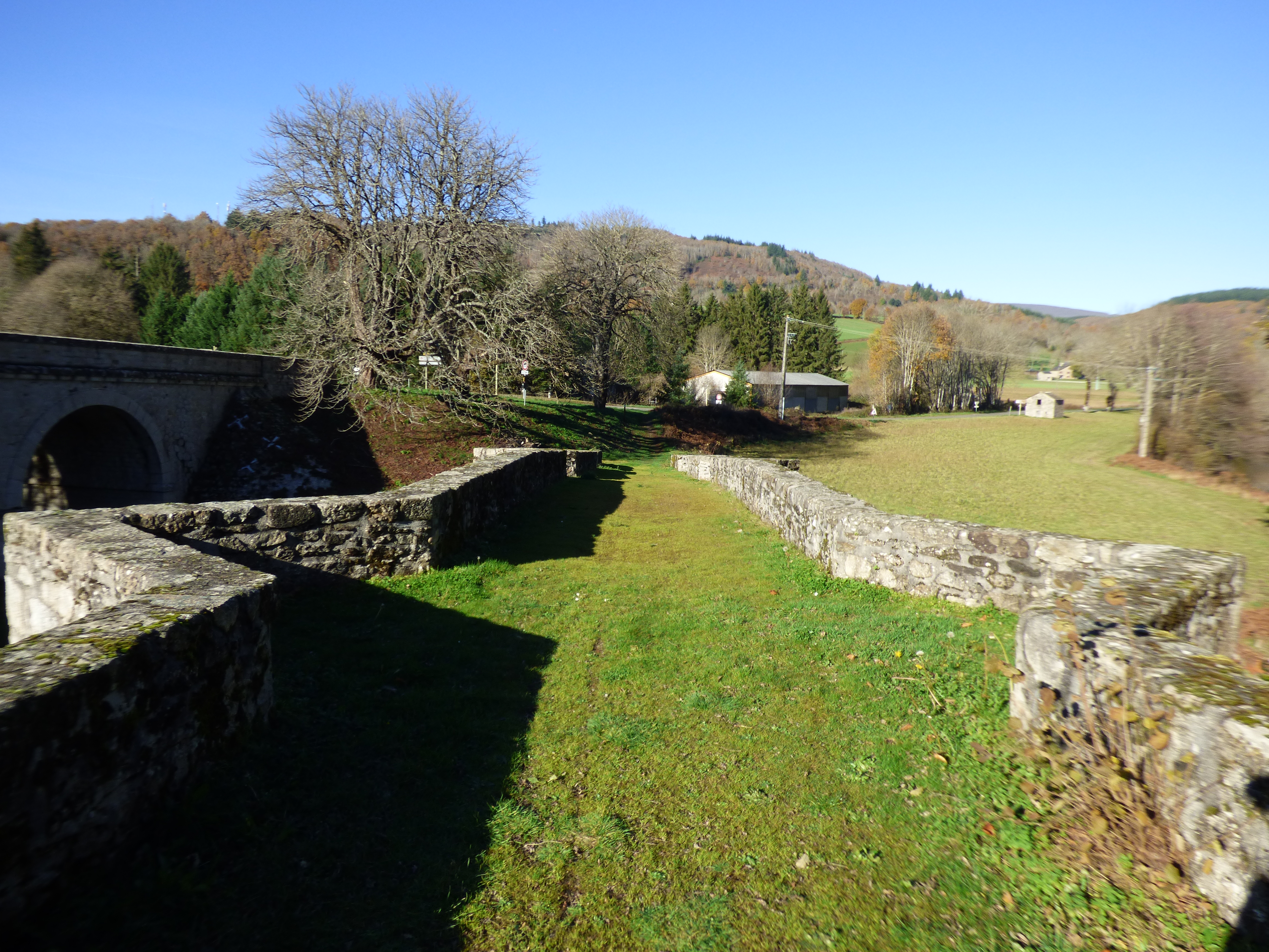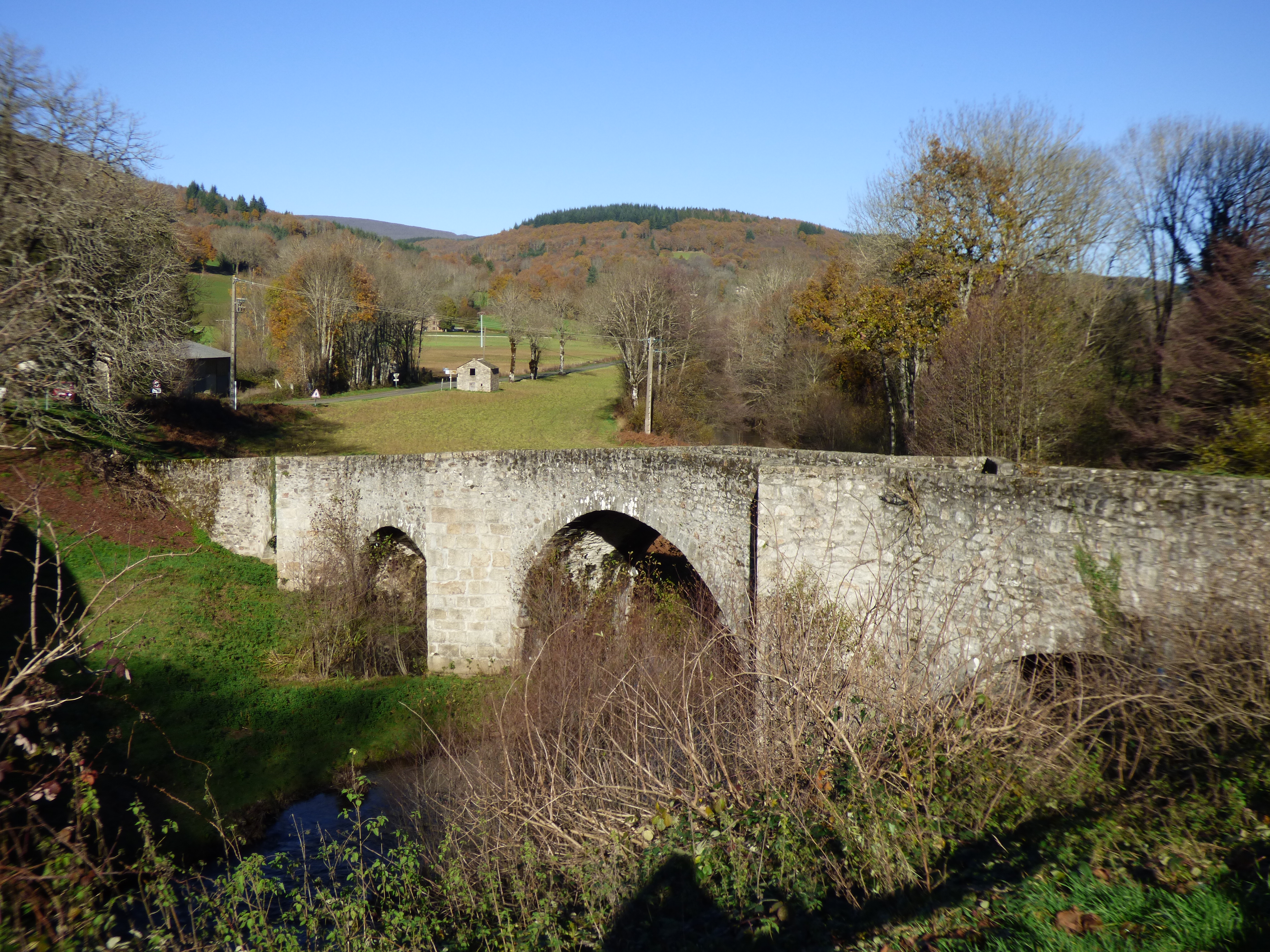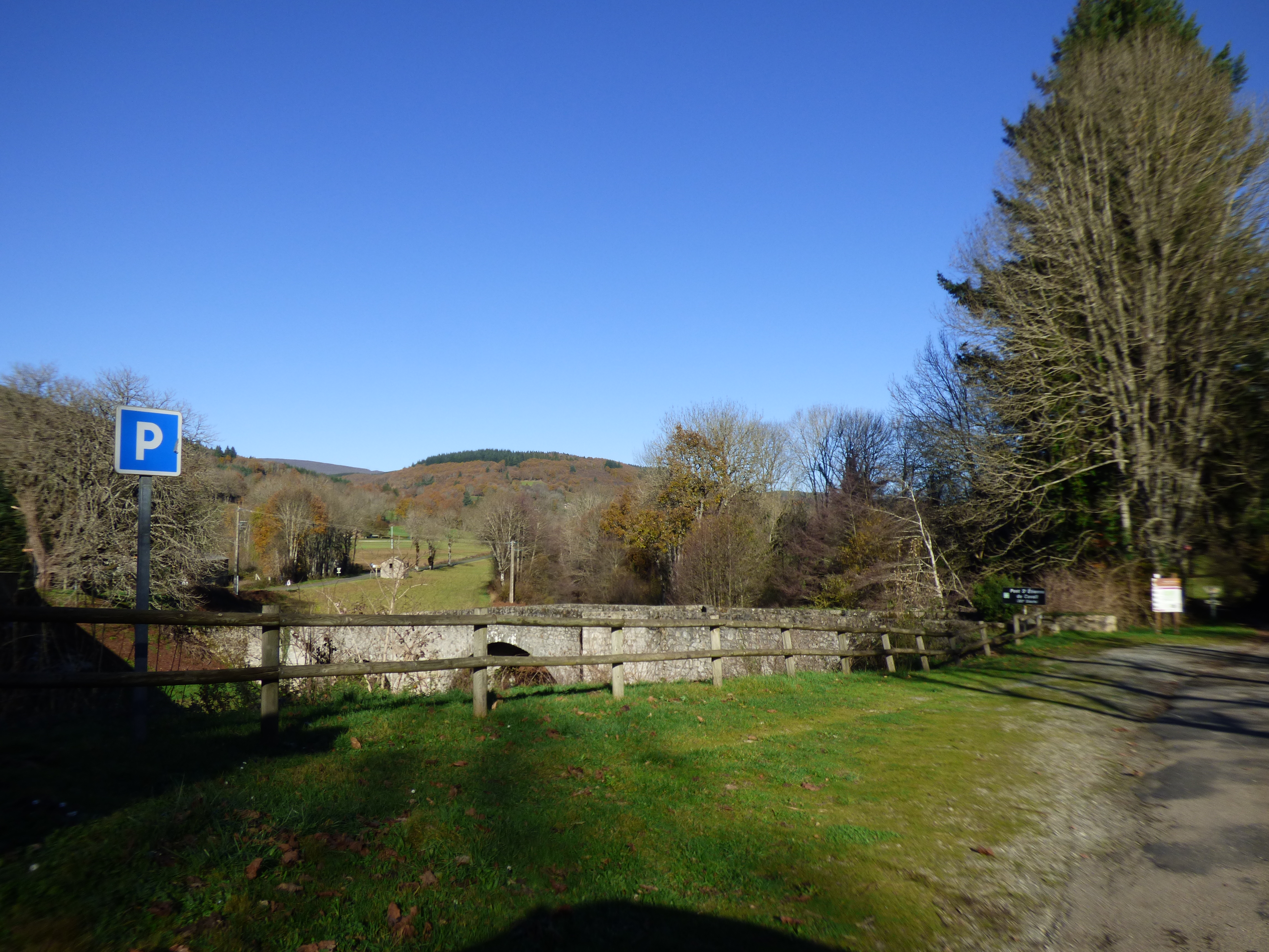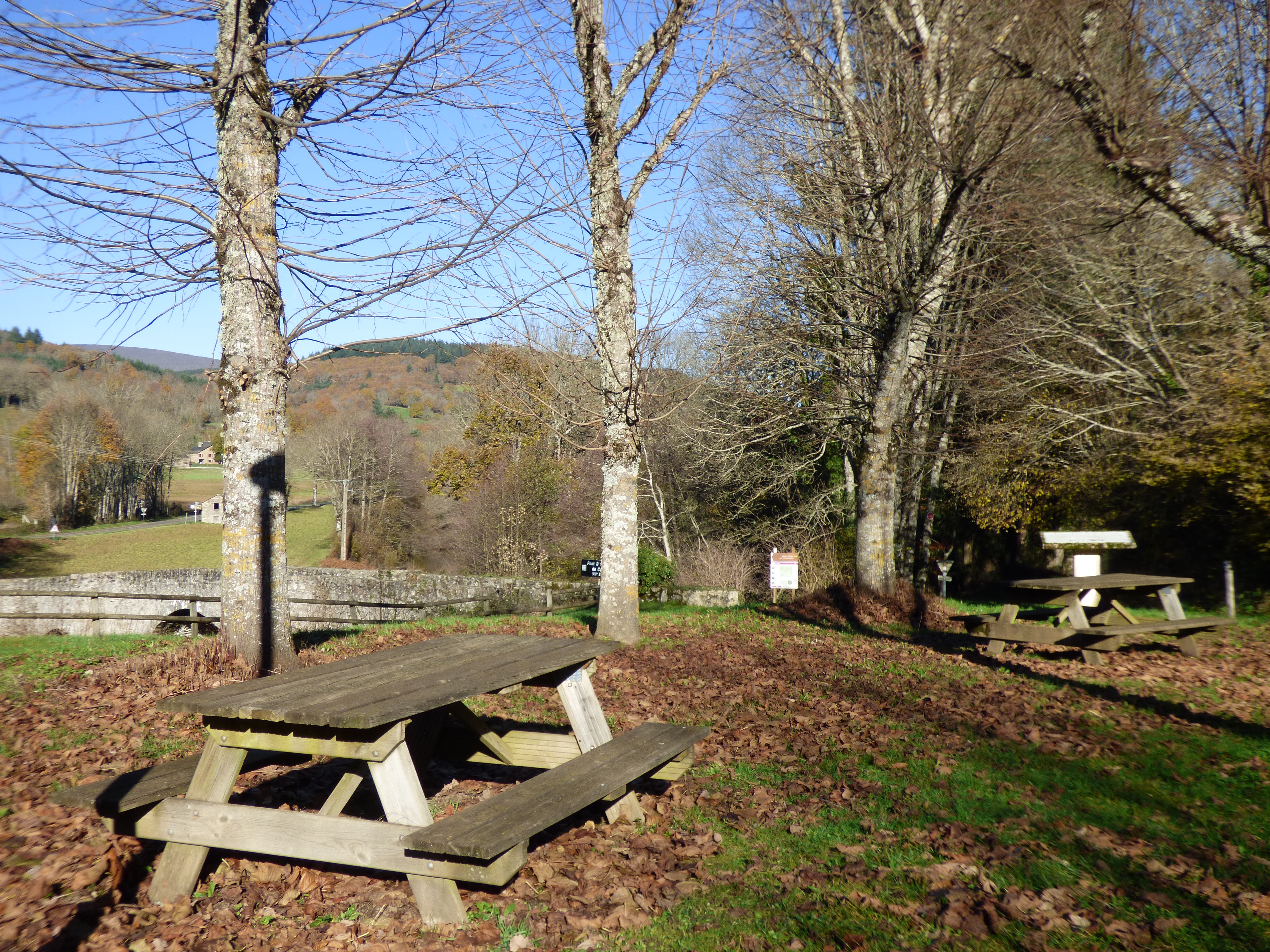 Aire ombragée en bord de route, proche du pont Saint Etienne de Cavall daté du XIIe siècle et de la chapelle du même nom, XIe et XIIe siècles.