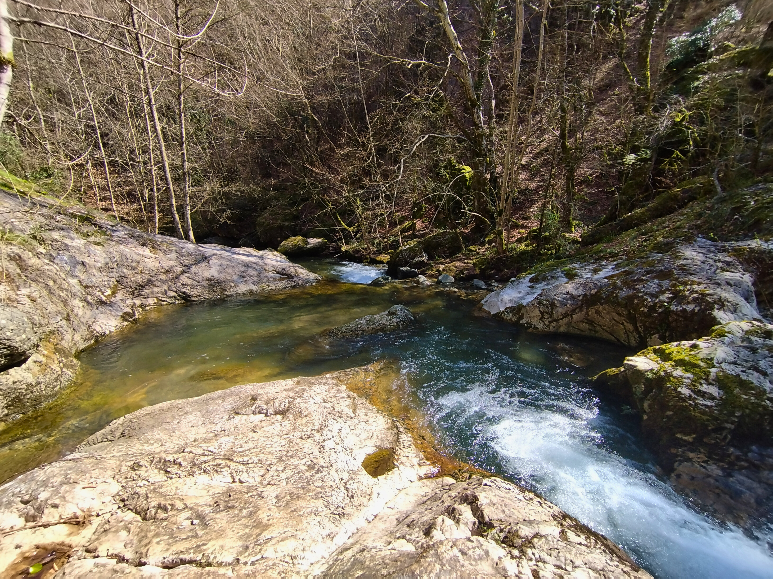 Vous atteignez «les marmites», des cavités de formes circulaires taillées dans la roche qui forment le lit du cours d’eau.