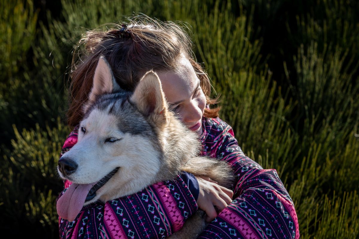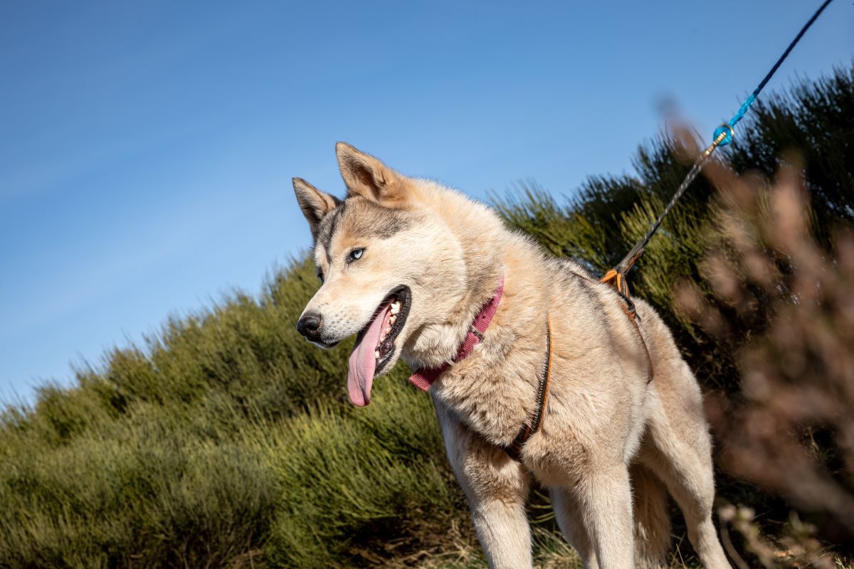 Balade pour adultes et enfants à partir de 7 ans avec un husky relié par une longe amortie à une large et confortable ceinture de cani-marche.