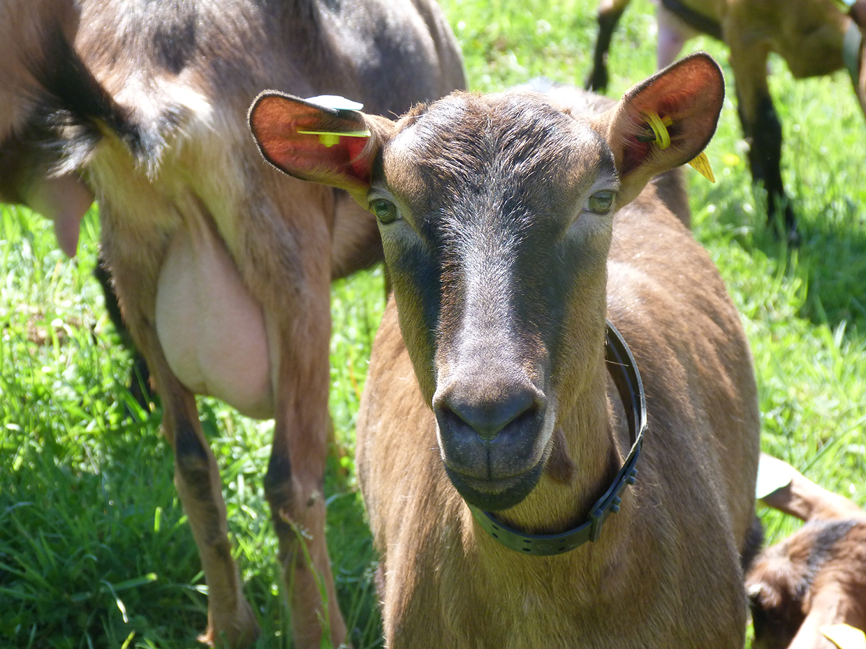Nous élevons une centaine de chèvres pour la fabrication de fromages frais et affinés, de tommes et de yaourts. Une partie du lait est vendu à la laiterie de Viane. Les chèvres pâturent sur nos terres et se nourrissent du foin produit sur l'exploitation.