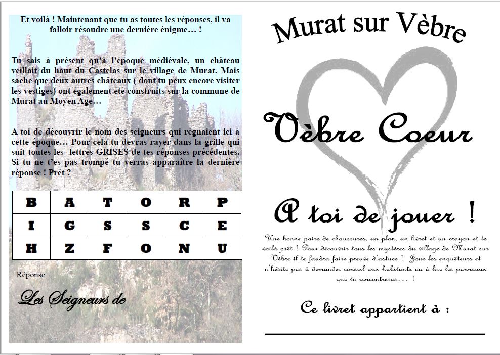 Jeu de piste à réaliser en famille pour découvrir, toute en s'amusant, l'histoire et les monuments de Murat-sur-Vèbre.