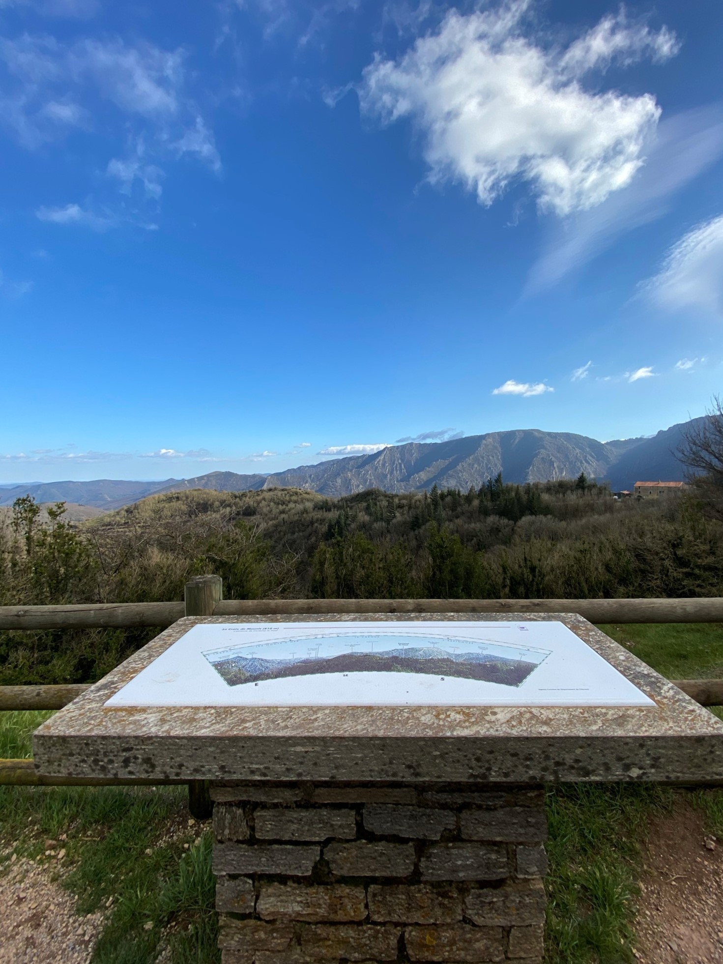 Culminant à 809 mètres d'altitude, le promontoire où trône la croix est placé en bord de route et présente une superbe vue panoramique, certainement l’une des plus belle du département.