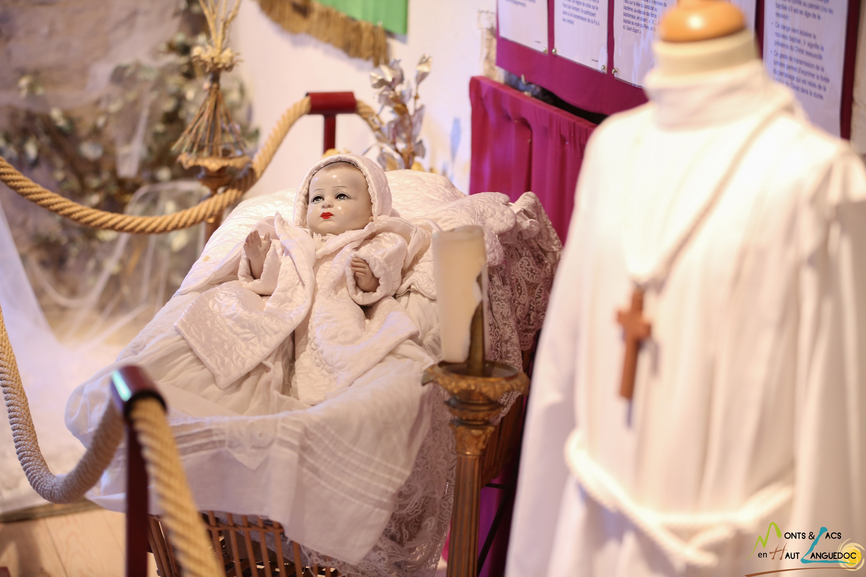 De la salle consacrée à la piété familiale on passe, à l’étage, dans la pièce qui fait revivre les grandes étapes de la vie du chrétien : baptême, profession de foi, mariage, … puis dans celle qui présente le déroulement de l’année liturgique : Noël, Pâques, …