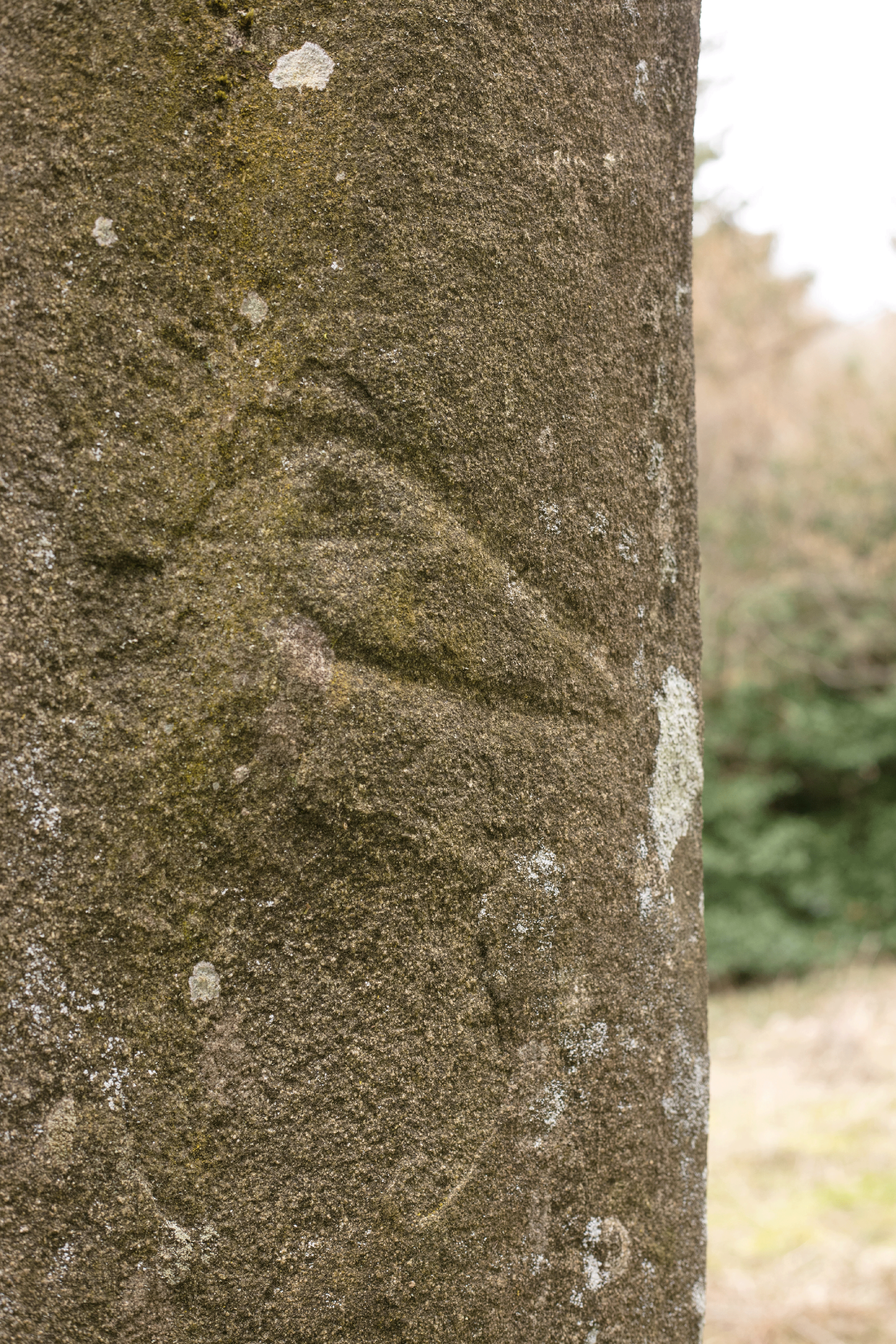 Sa face avant, relativement plane, révèle un visage stylisé, une crosse-hache rare et finement gravée (41 cm de long), une pendeloque-poignard, des jambes jointives et, partiellement, une ceinture. Ces attributs confirment l’appartenance de la statue au style saintponien, courant mégalithique caractéristique du Haut-Languedoc.