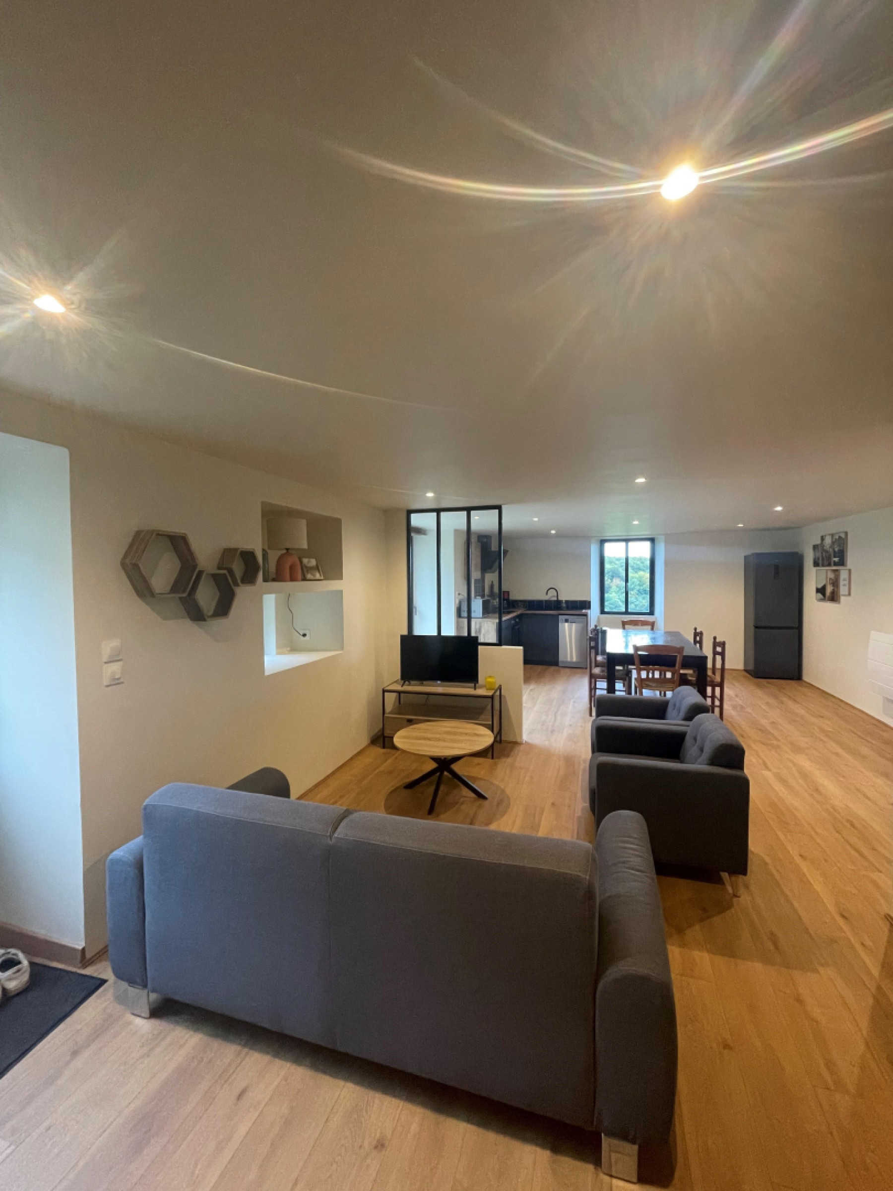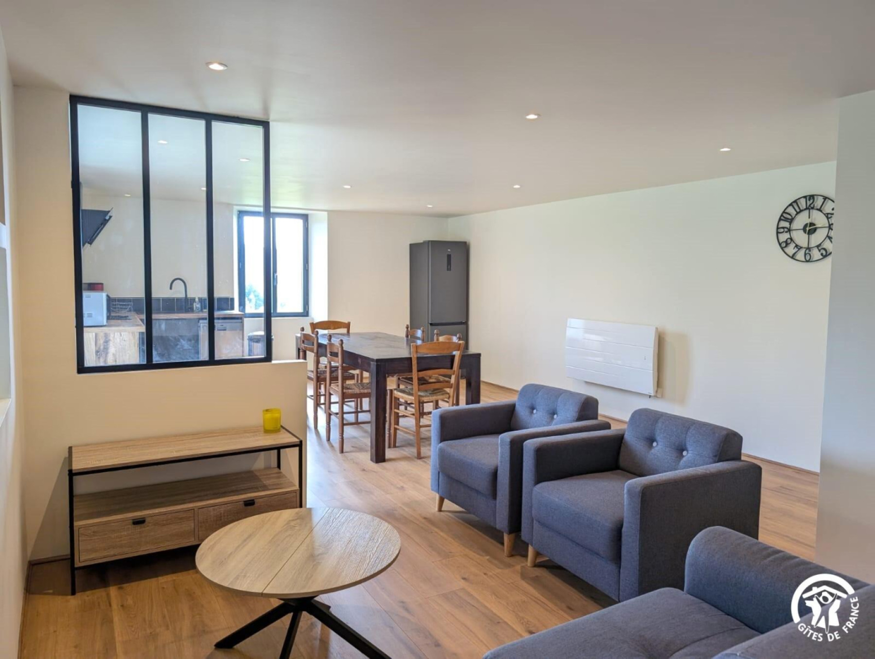 - Living room with seating area (sofa + coffee table) and dining area with equipped kitchen.