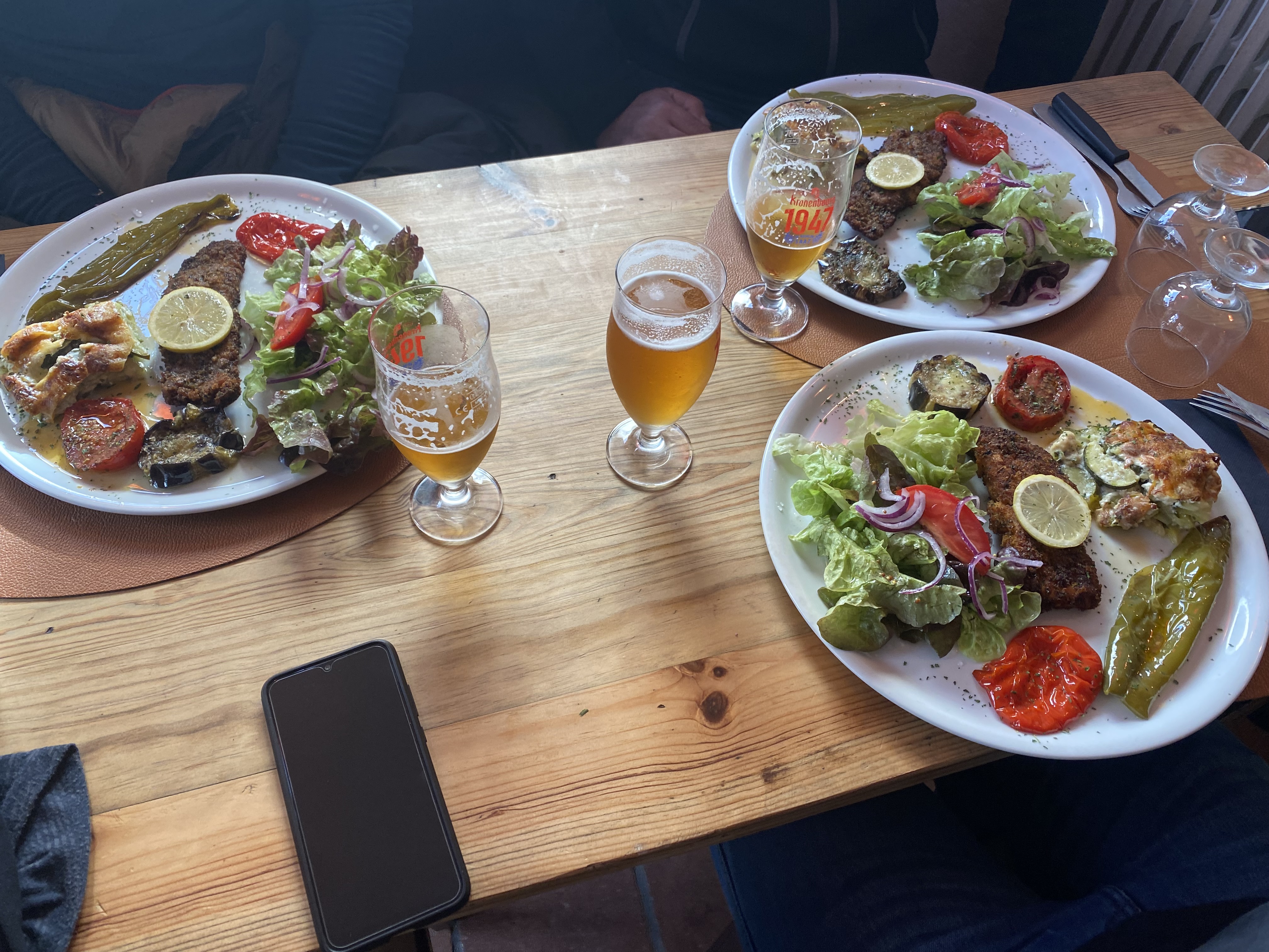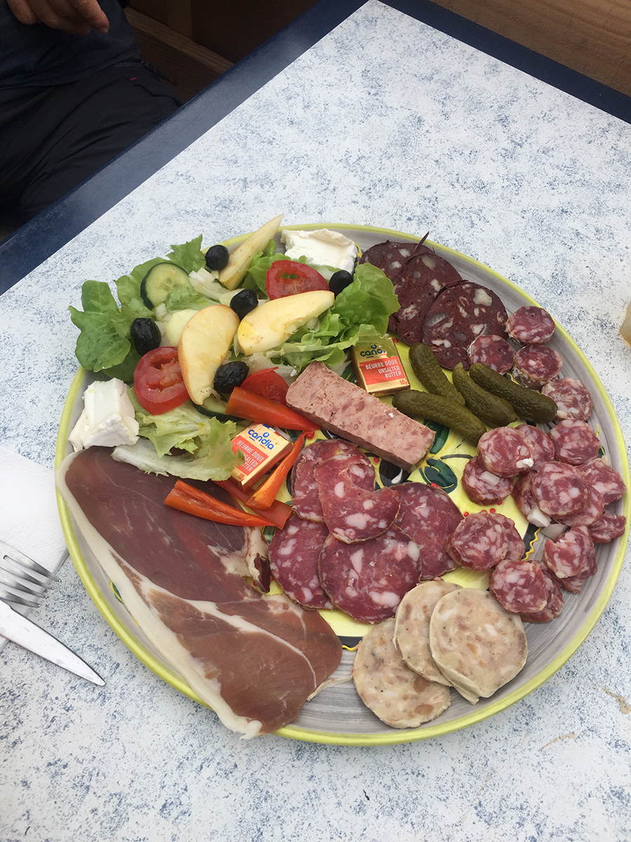 Plat du jour, formule du jour, carte de salades composées, produits du moment, assiette de charcuterie et fromage de Lacaune.