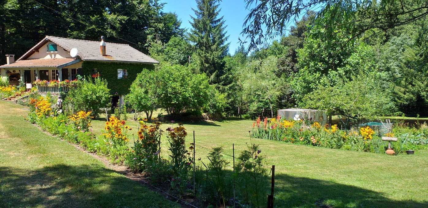 Une maison campagnarde située sur un terrain de 5000m², arborée, vallonnée, un étang, un petit ruisseau, un jardin potager avec légumes BIO, un jardin floral qui a remporté le 1er prix au concours du Meilleur Jardinier du Haut-Languedoc 2017 et 2019.