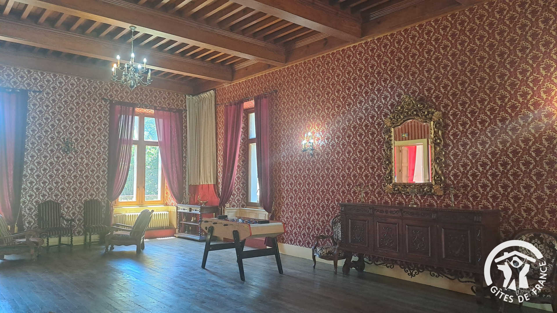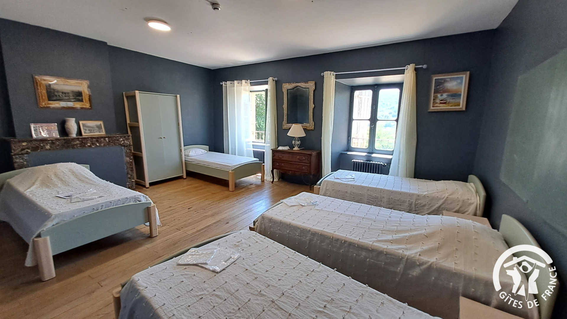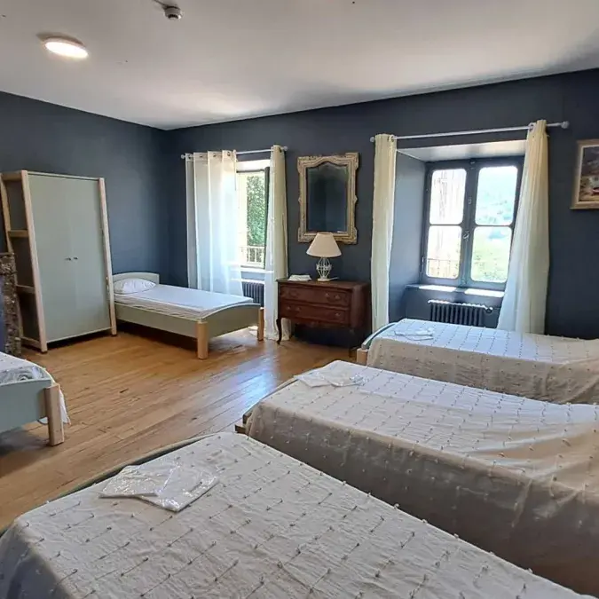Le château compte 18 chambres réparties au 1er et 2e étage (sans ascenseur). Les chambres accueillent de 2 à 5 personnes avec des lits simples en 90x190cm et des lits doubles en 140x190cm. Sanitaires collectifs. Une chambre avec sanitaires privatifs. Possibilité de petit-déjeuner, repas, location de draps...