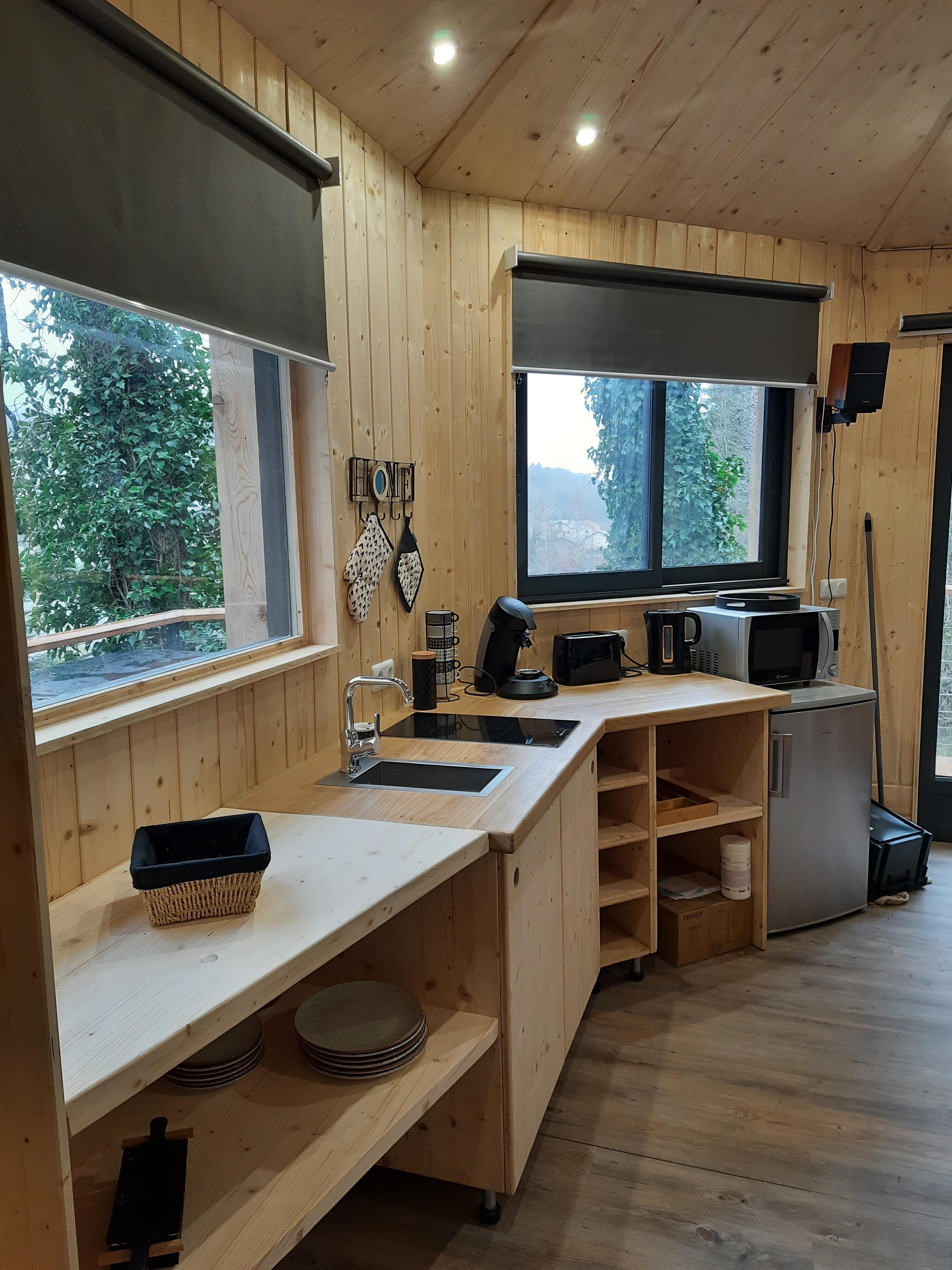 Environ 27 m² avec une terrasse, jacuzzi avec vue panoramique, accès illimité à la piscine, transat, wifi dans la cabane, petite bouteille de champagne 37,5 cl, petits déjeuners en panier déposés à la poulie, une place de parking privé, forfait ménage inclus, linge de toilette inclus, toilette et salle d'eau dans la cabane, home cinéma.