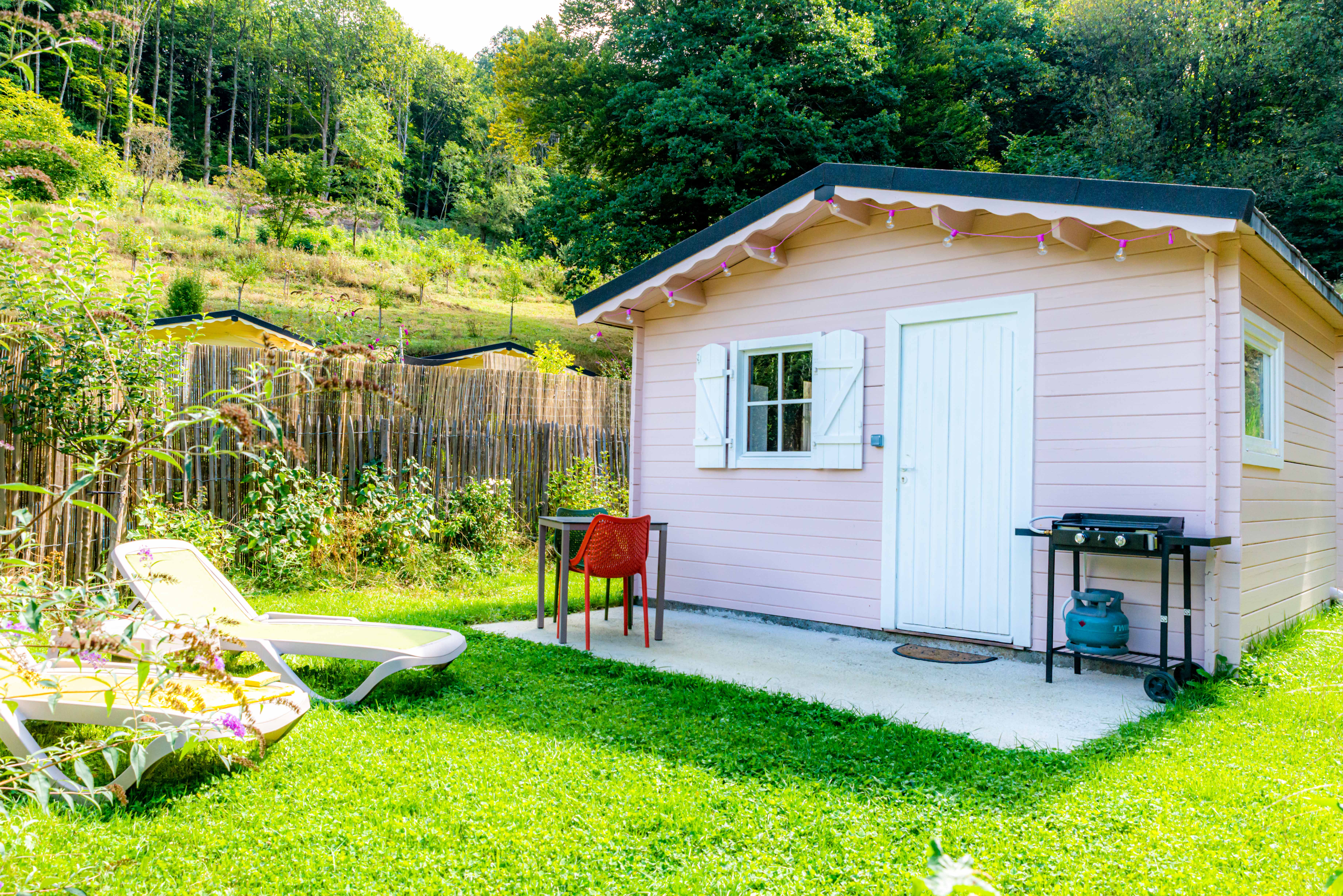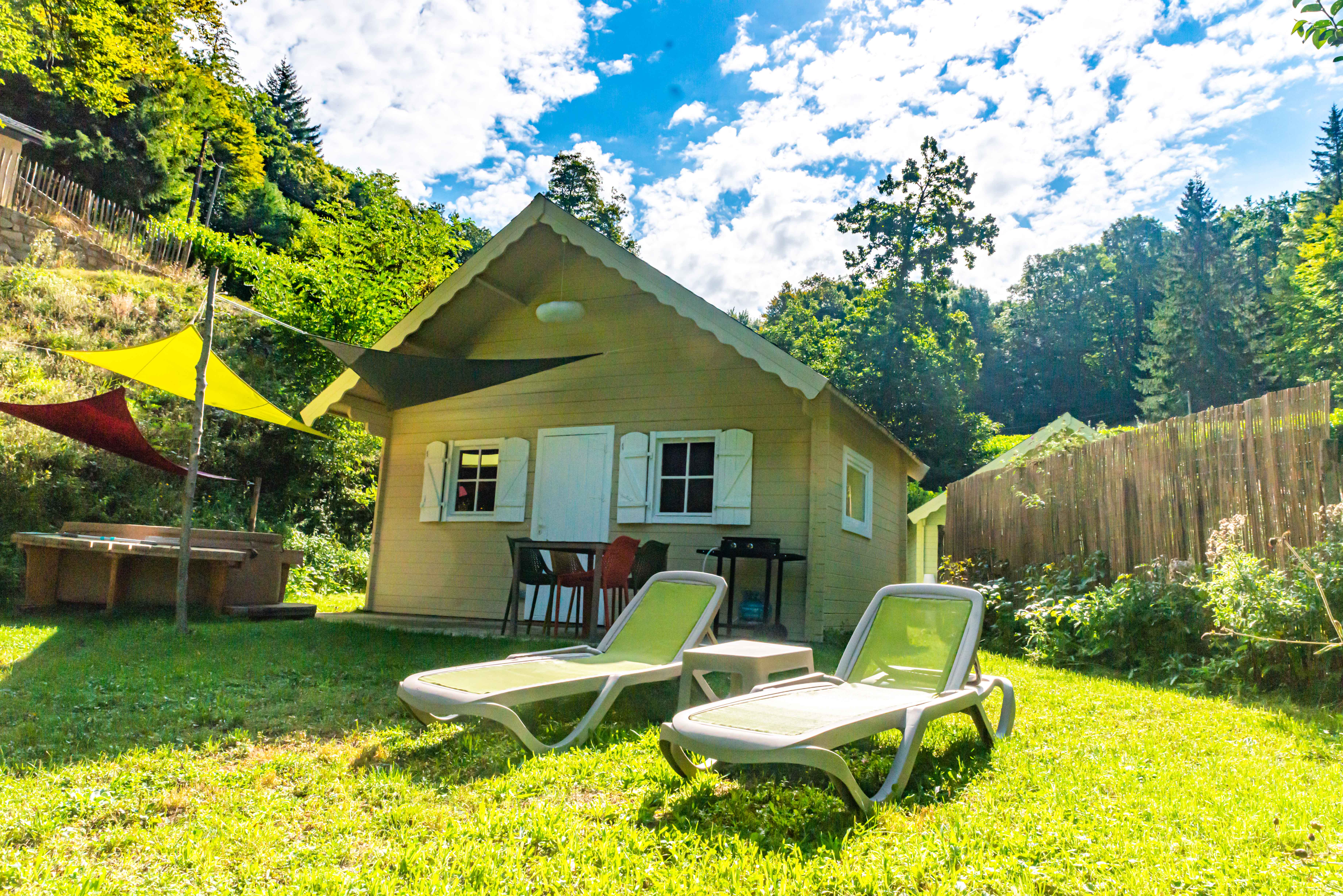 Des Cabanes dans les bois tout confort, certaines avec Jacuzzi privatif, toutes avec salle d’eau et cuisine ! Chaque cabane a sa décoration personnalisée, selon l’authentique atmosphère des maisons de nos grands-mères... Un domaine de 6 hectares dans la forêt, pour vous ressourcer au cœur de la nature. Profitez du sauna avec sa vue panoramique ou bien d’un bain de forêt dans le jacuzzi installé dans votre jardin. Literie***, label Valeurs Parc, naturellement !