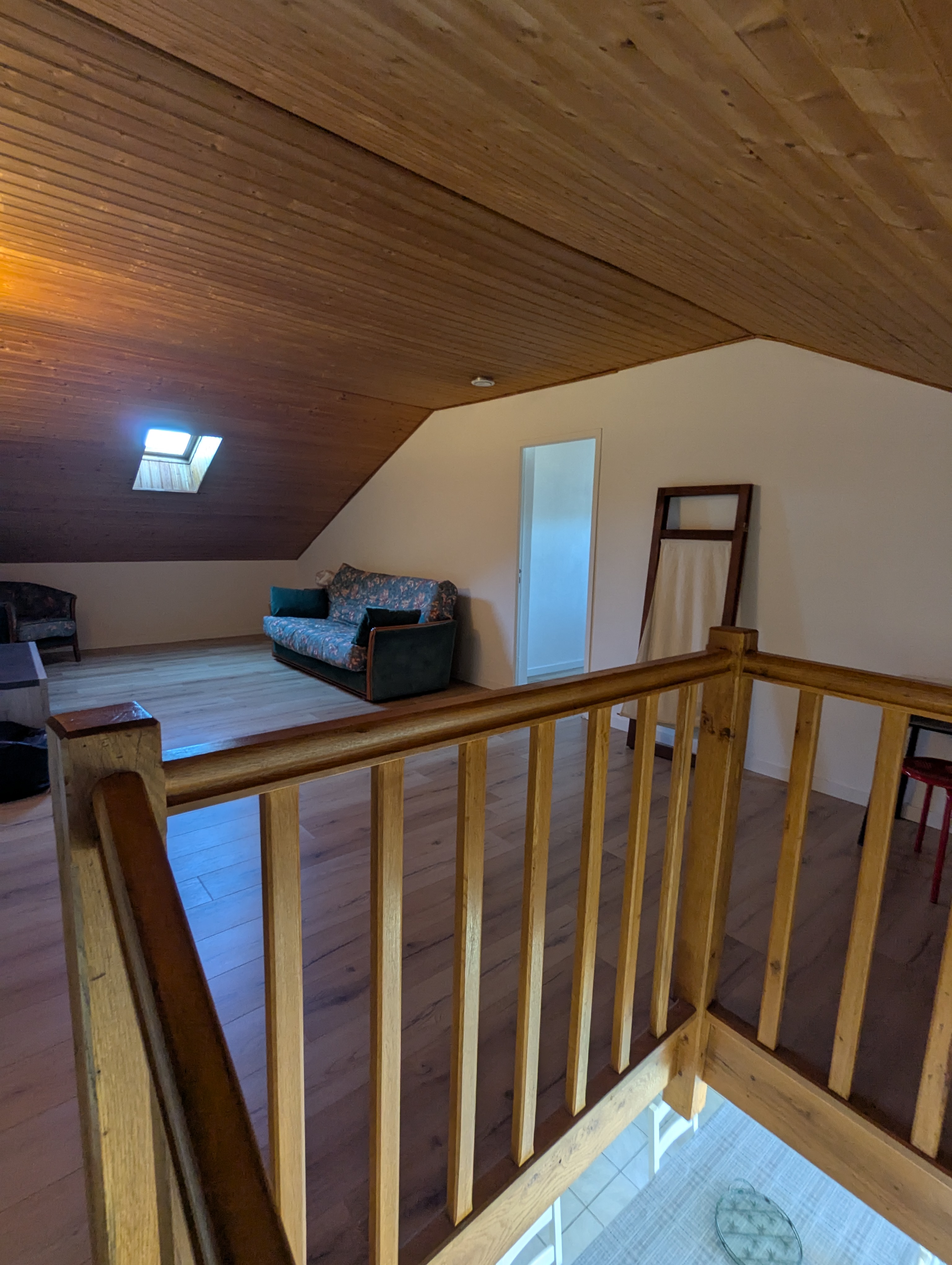 - un espace mezzanine avec un canapé lit/coin jeux et une chambre (lit 140x190) et salle de bain,