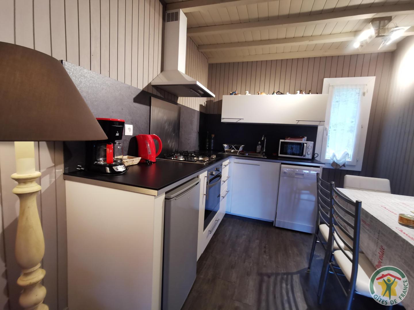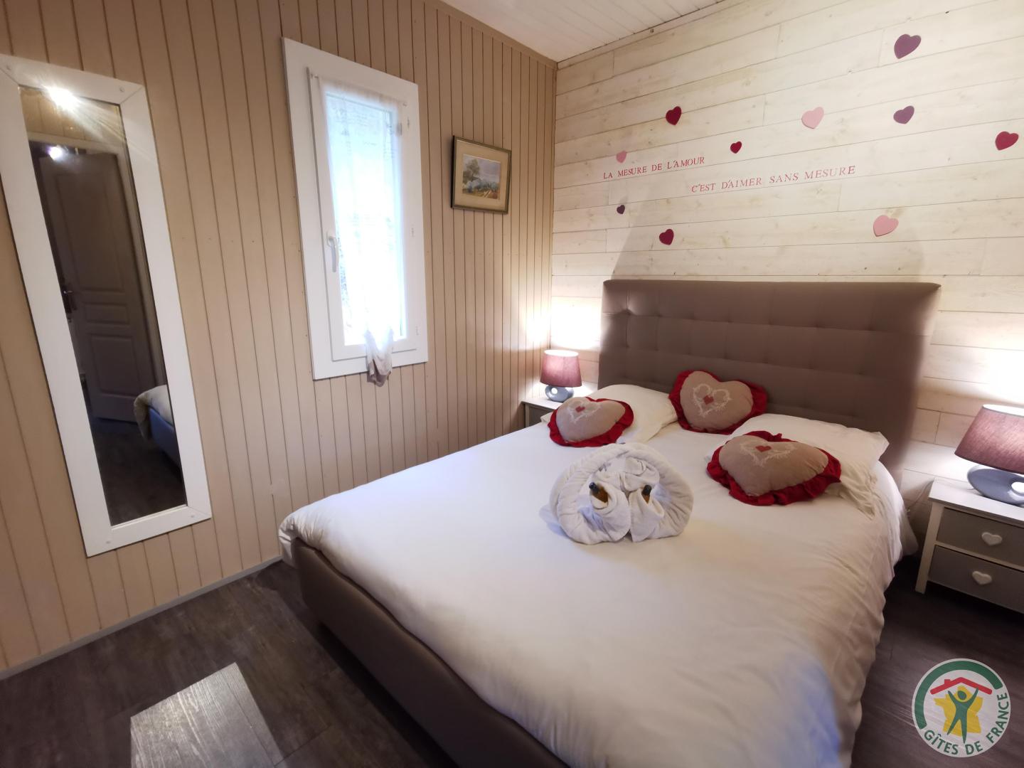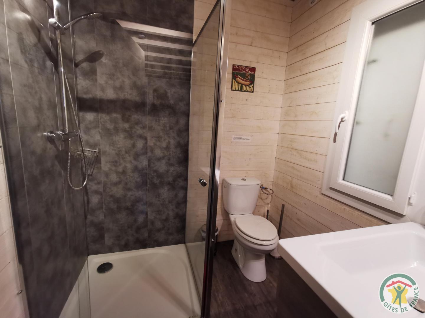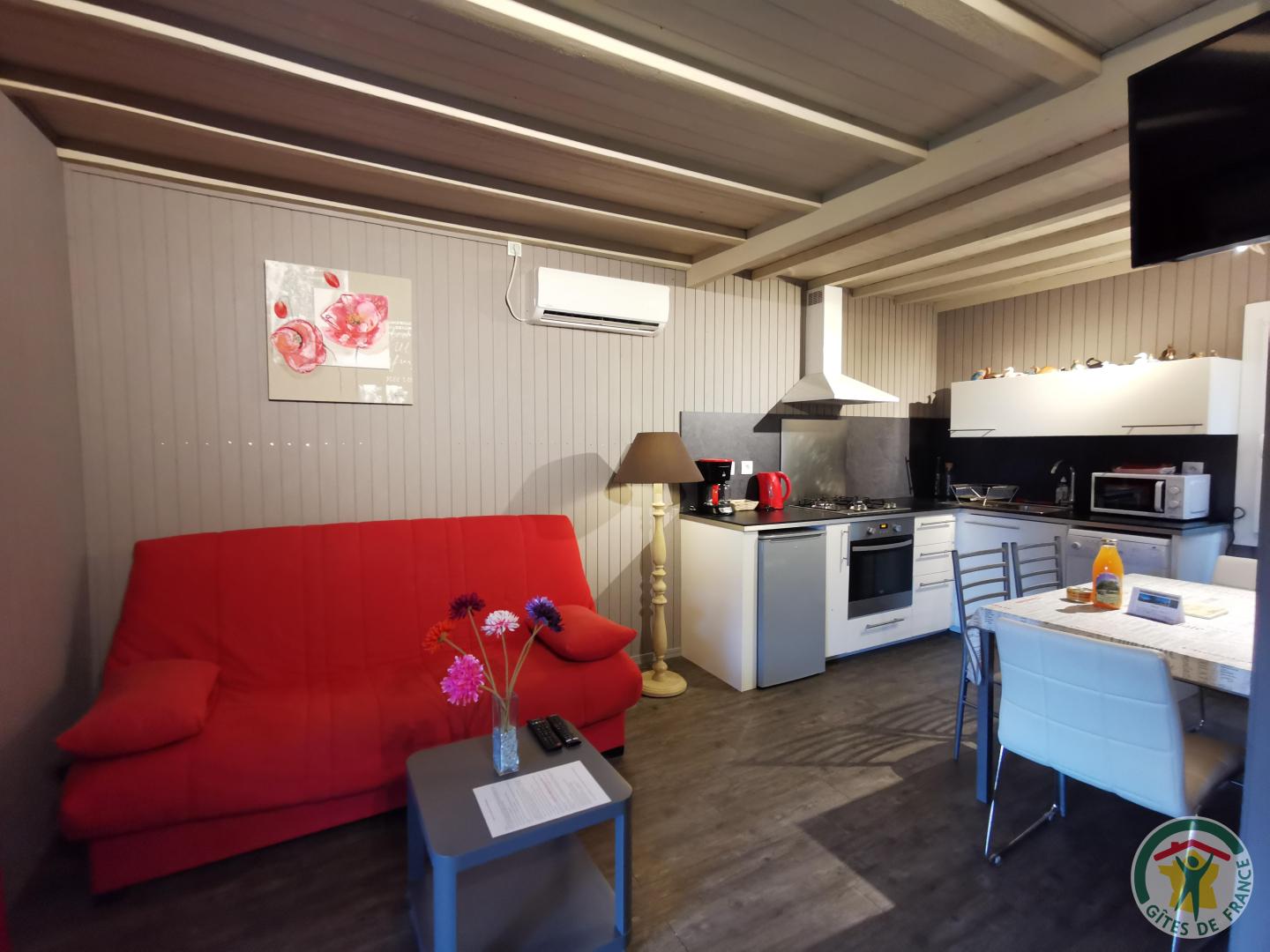 La pièce à vivre inclus une cuisine équipée ainsi qu'un canapé convertible. Elle dessert une salle d'eau avec WC ainsi qu'une chambre confortable, à la décoration romantique (lit de 140x190).