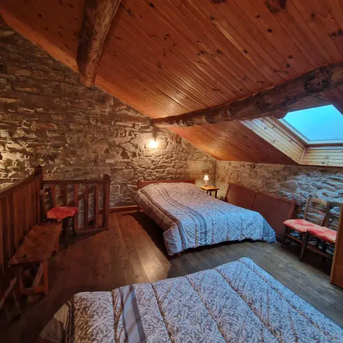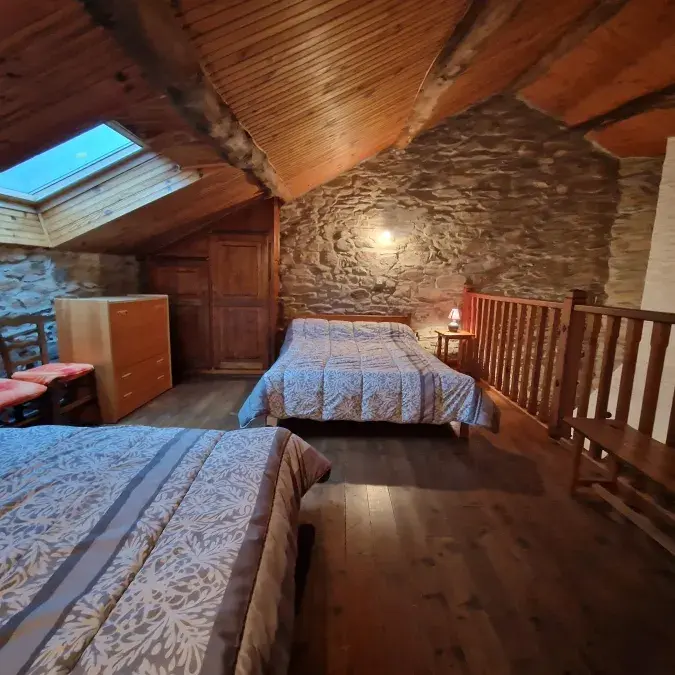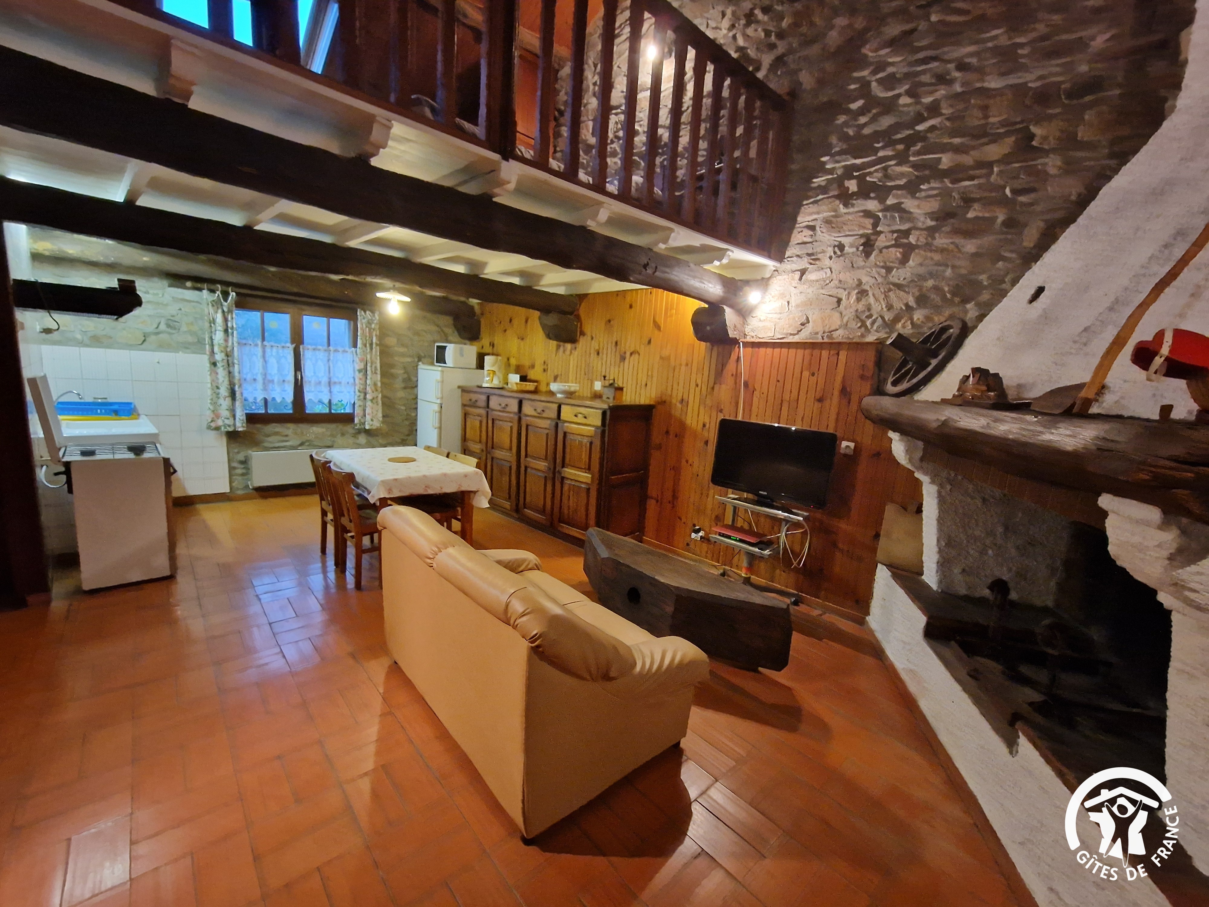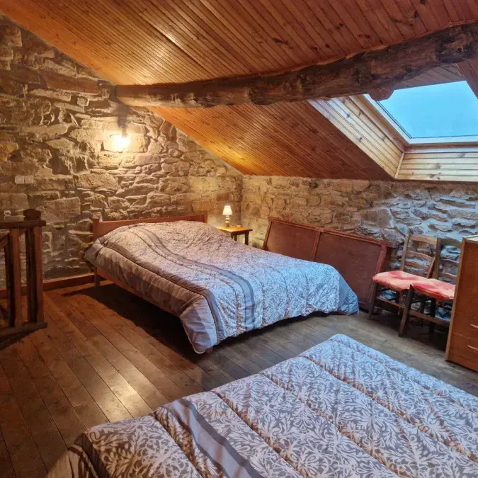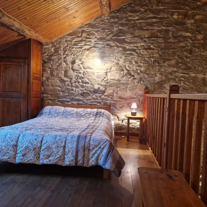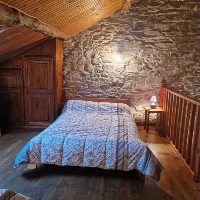 A l'étage en mezzanine, deux lits doubles 140X190, 1 lit-commode 0.90. Un paravent est disponible pour séparer les 2 couchages. Chauffage électrique, cheminée bois.
