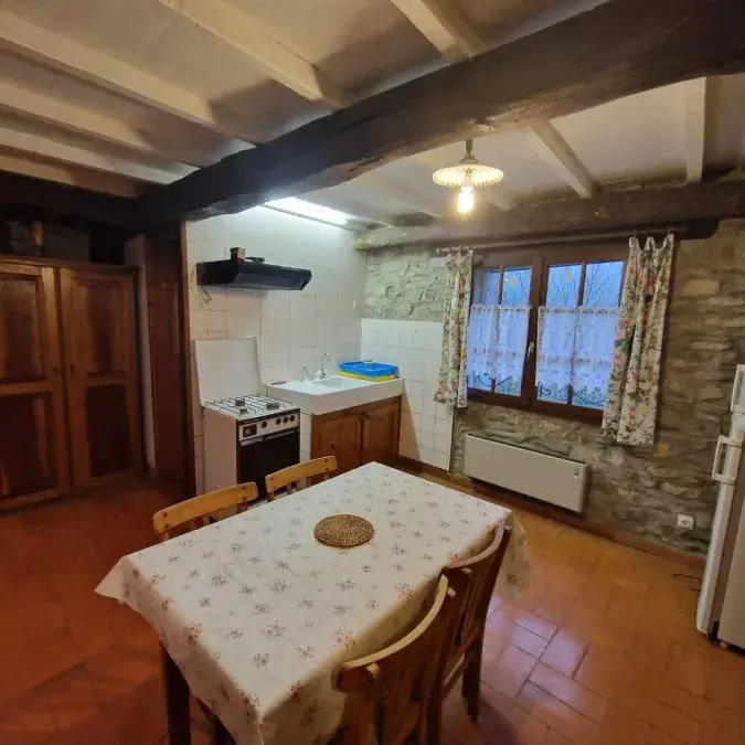 Rez-de-chaussée : pièce à vivre avec cheminée, coin-cuisine, salle d'eau avec wc. sèche cheveux. La cuisine est équipée d'un réfrigérateur-congélateur, d'une gazinière 3 feux avec four, grille pain, mixer, batteur, hachoir, cocotte minute, micro-ondes, cafetière à filtre, divers plats et accessoires de cuisson.
