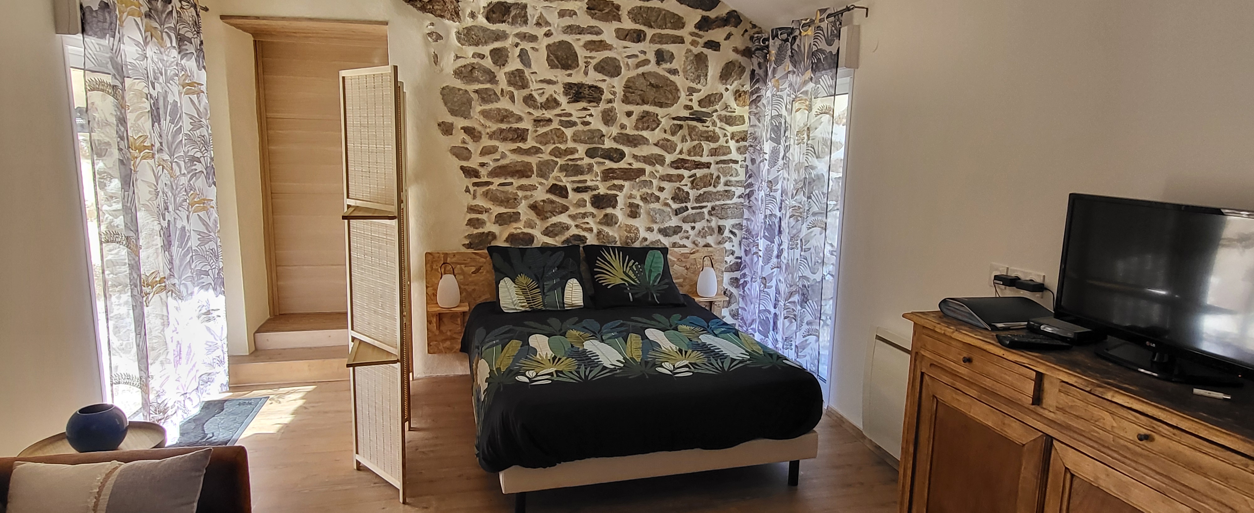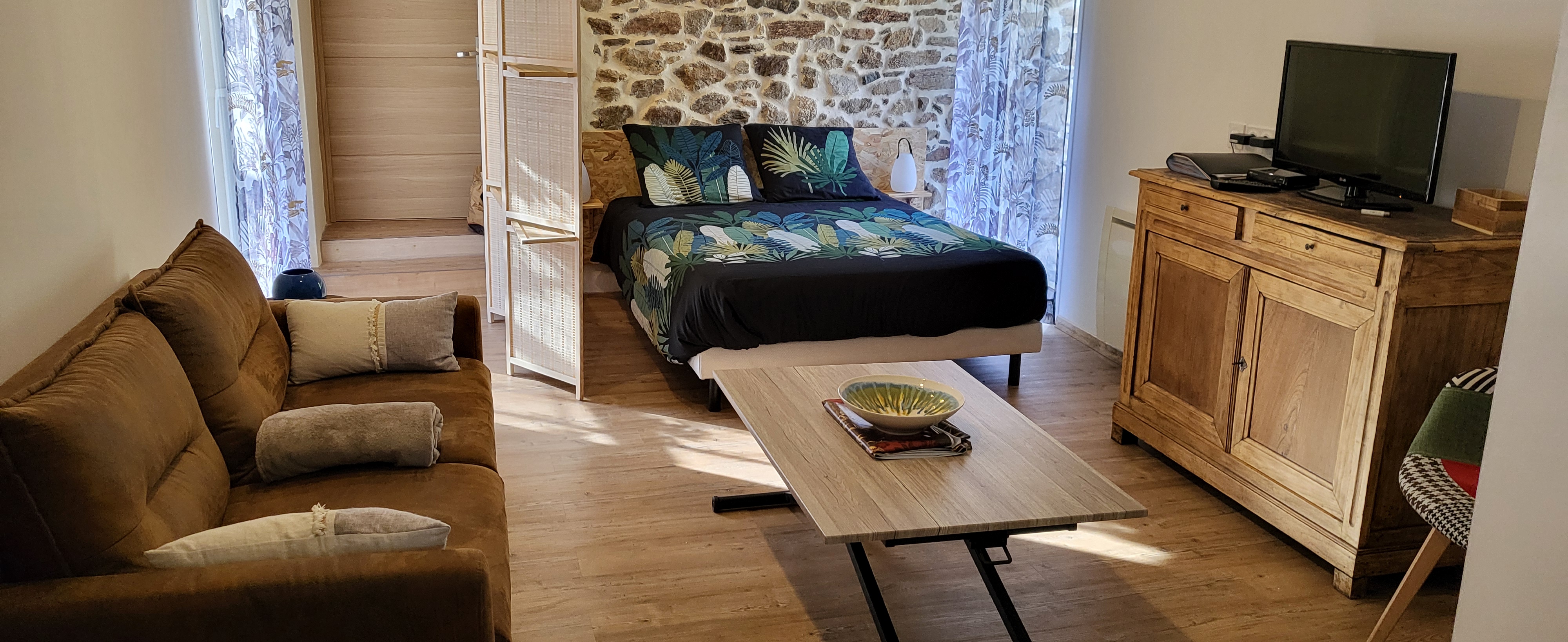 Le studio de 35 m² est entièrement rénové, avec voûte apparente. Situé dans le Hameau de Coustorgues le bas, il est décoré avec goût et sera le point idéal de départ pour visiter notre magnifique région.