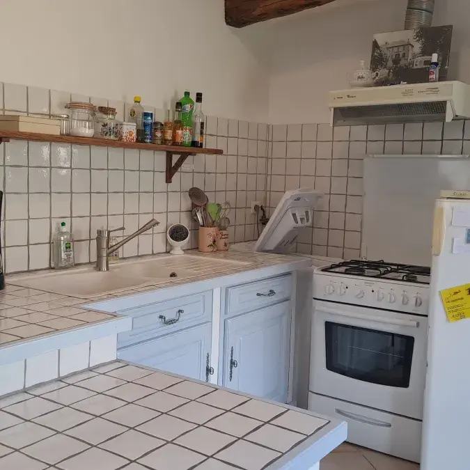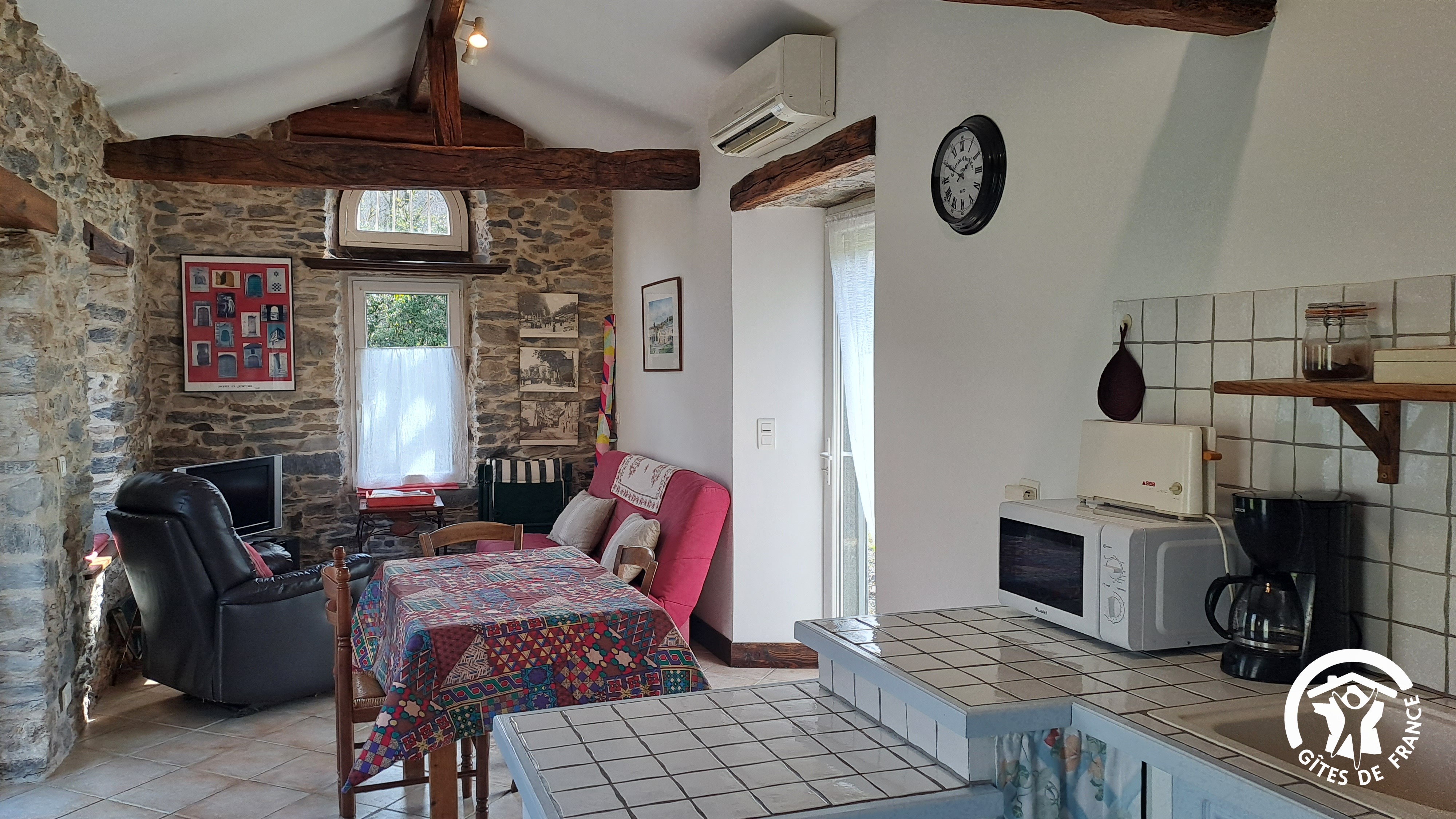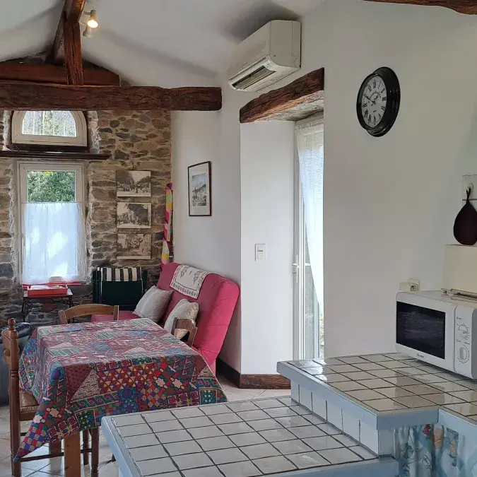 - Pièce à vivre avec coin salon, table à manger et espace cuisine : micro-ondes, gazinière avec four, cafetière à filtre, réfrigérateur, grille-pain et machine à laver le linge. Nécessaire des premiers jours disponible : huile, sel, poivre, café...
