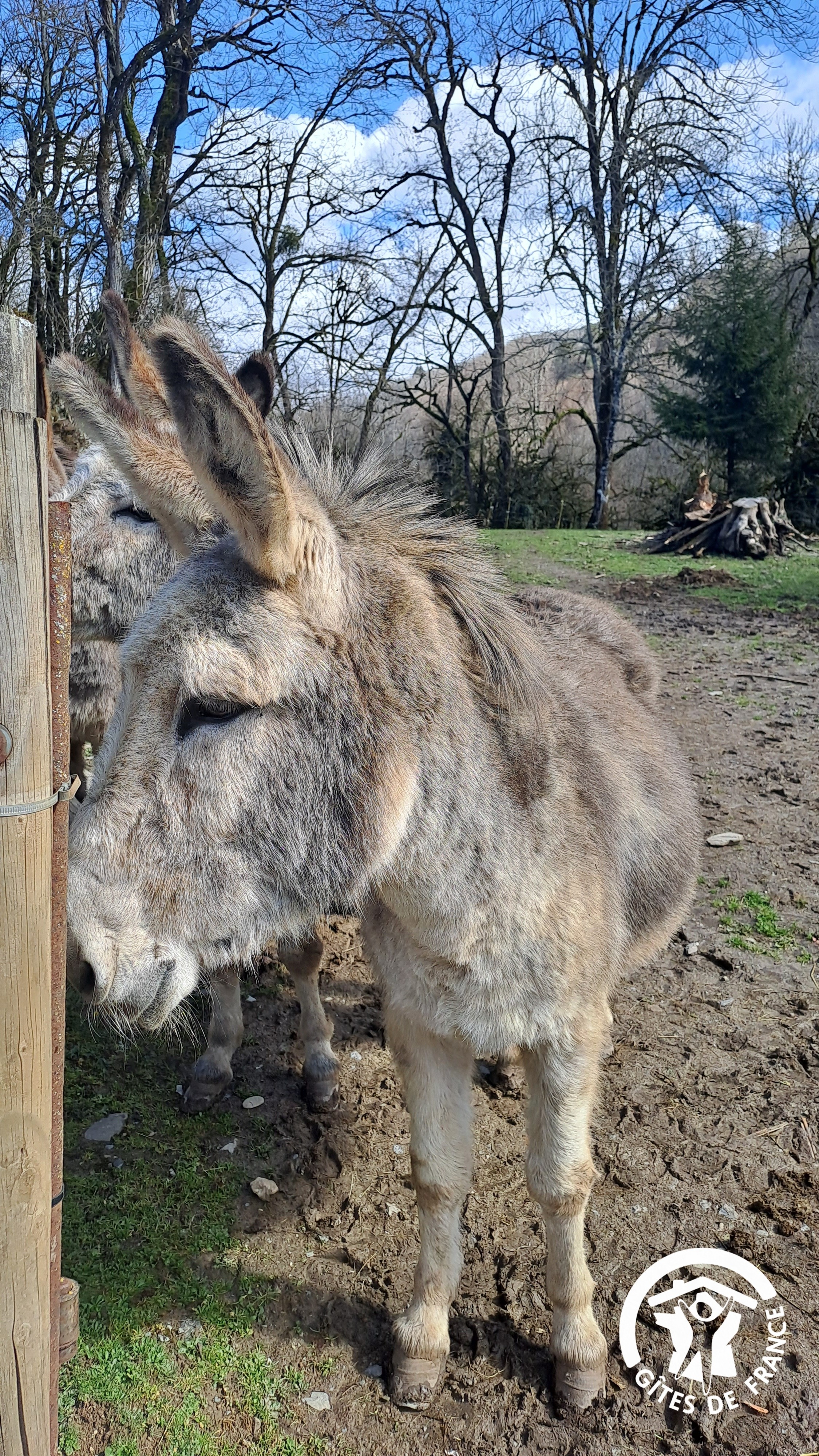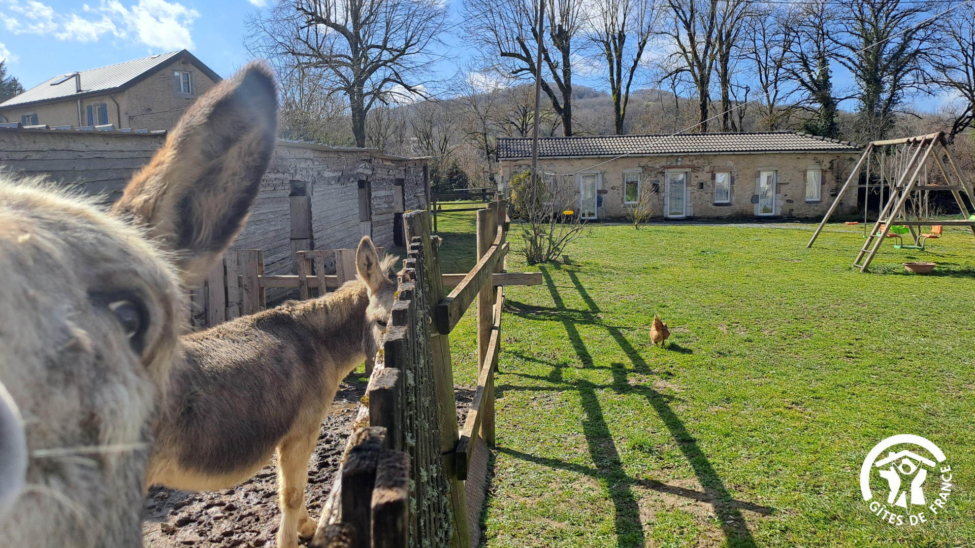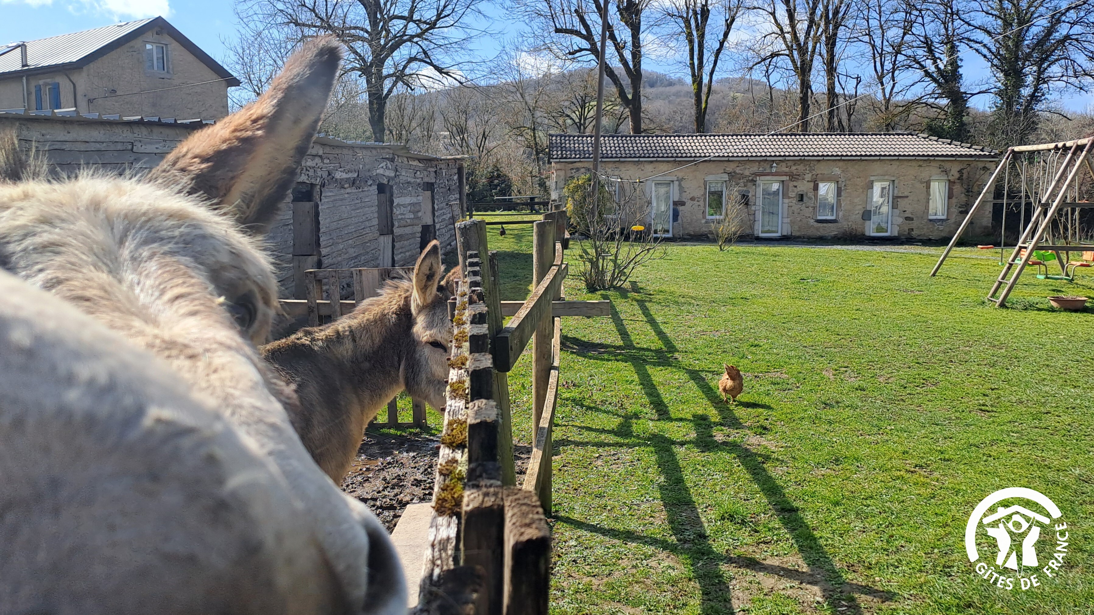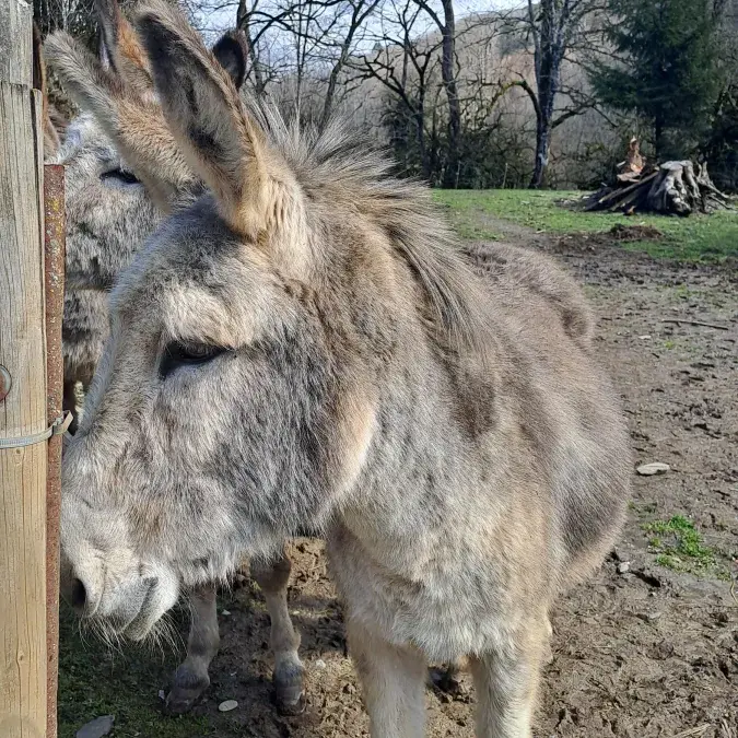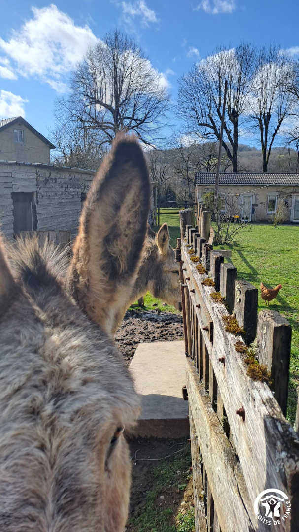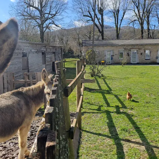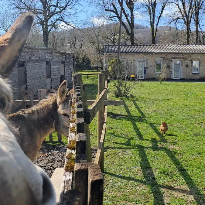 Vous pourrez vous garer juste devant le gîte. Cour commune à partager avec les propriétaires, ainsi que 2 poules, 1 chat et bien évidemment, Charly, Oli et Lili, les 3 ânes de la propriété qui ne demandent qu'à être caressés !