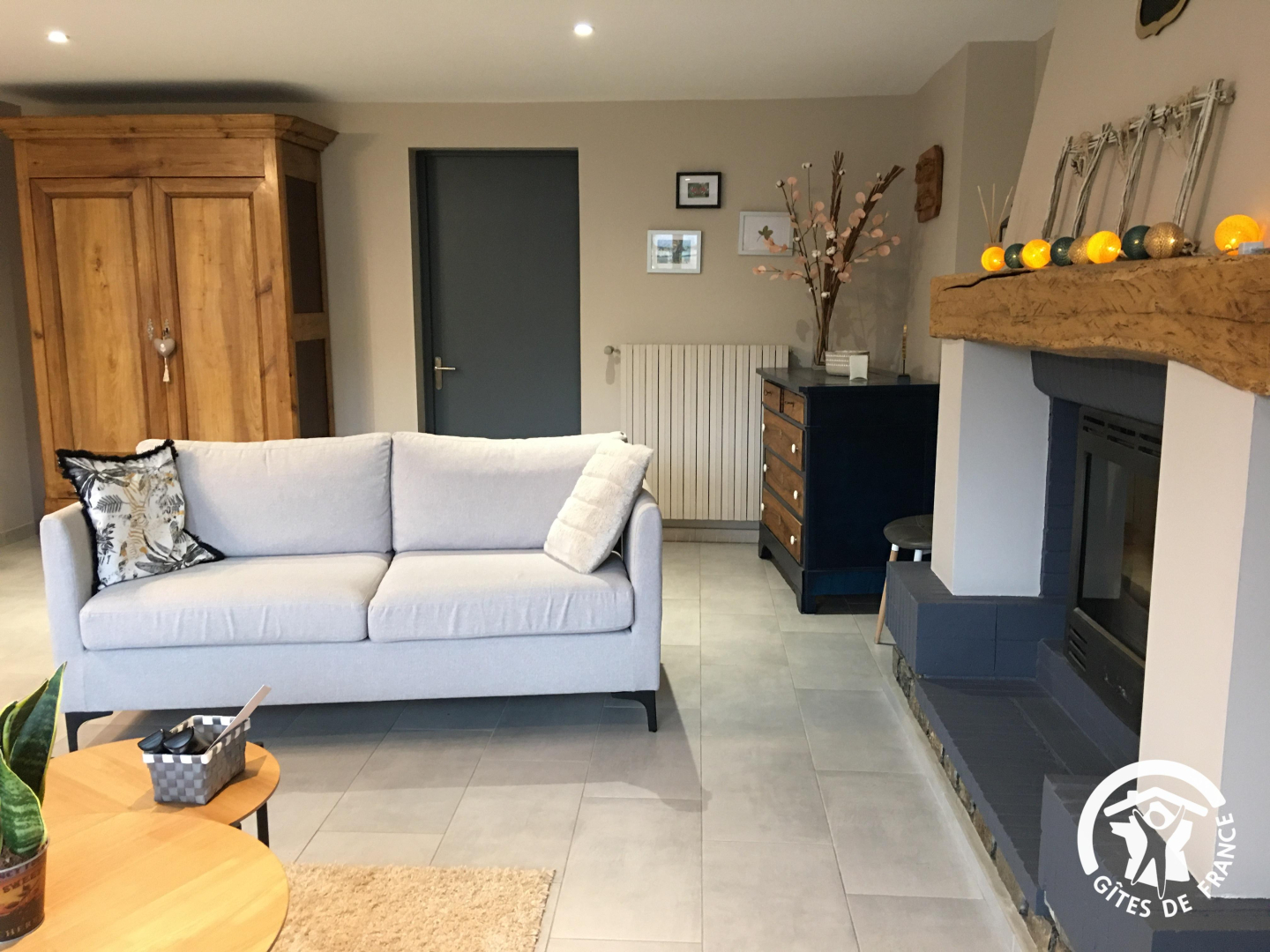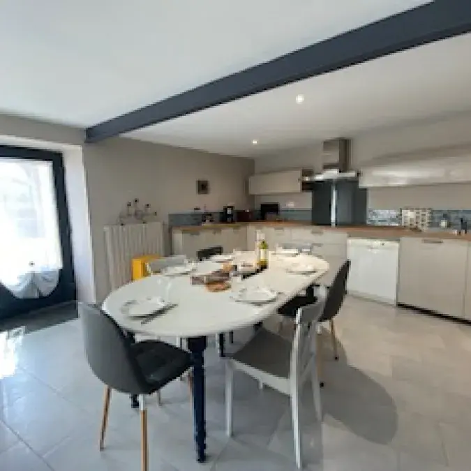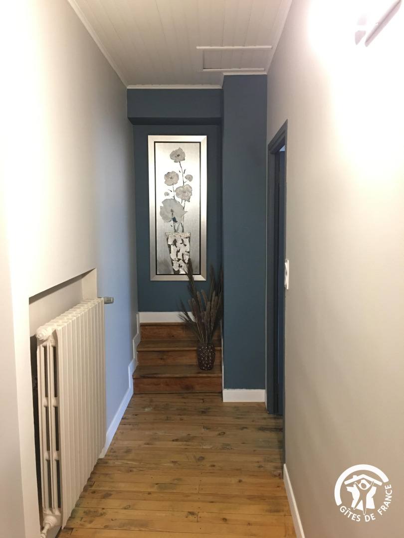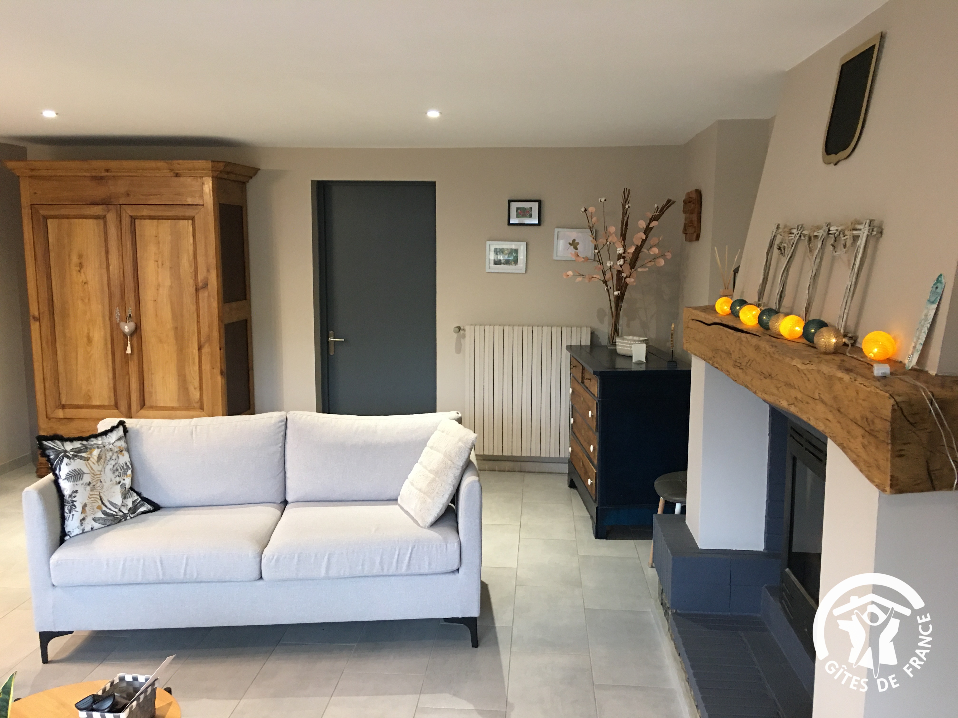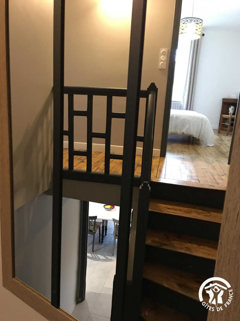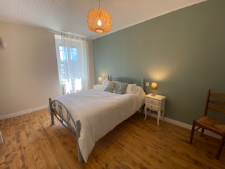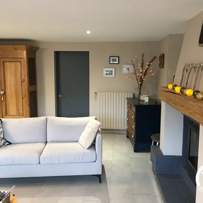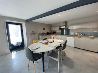La maison mitoyenne à celle des propriétaire a été récemment rénovée pour offrir des espaces cosy et lumineux. Le logement se trouve en étage. Les escaliers extérieurs à côté du parking vous mènent directement dans l'espace salle à manger- cuisine. Bien agencée, celle-ci se dispose d'un réfrigérateur avec compartiment congélateur, de cafetières à filtre et nespresso, de mixer, robot de cuisine, autocuiseur, appareil à raclette, grille-pain, bouilloire... Le coin salon s'agence autour de la cheminée – insert. Sur ce palier, se trouve la première salle d'eau avec toilettes.
