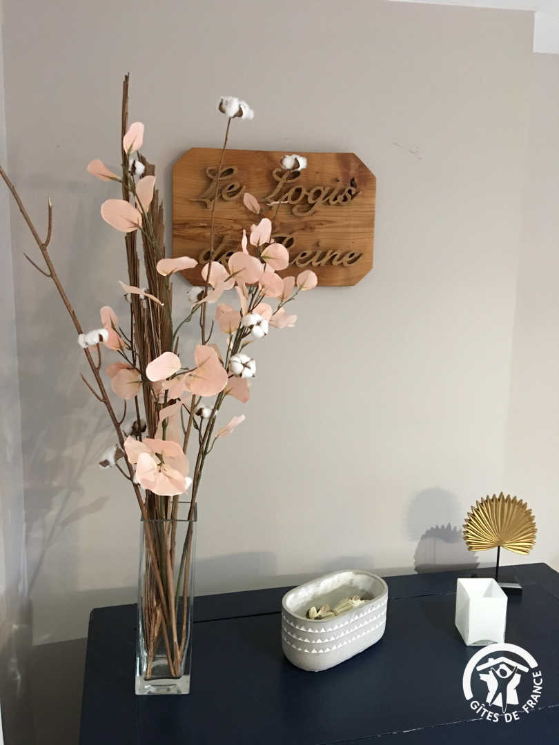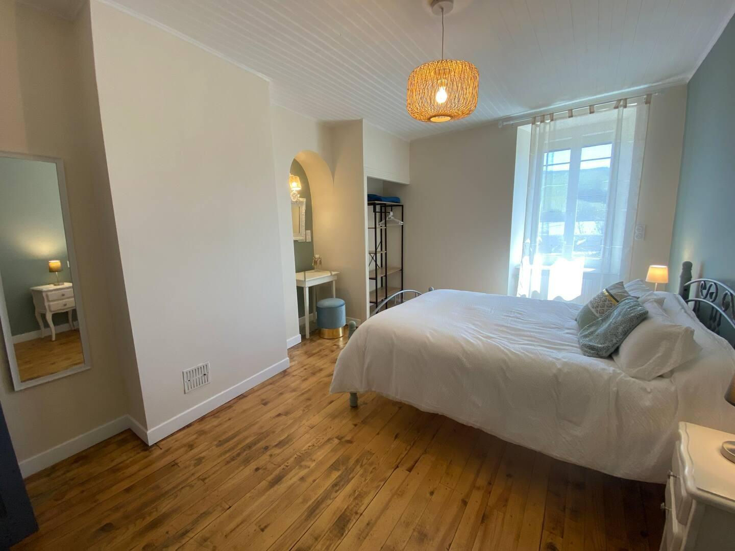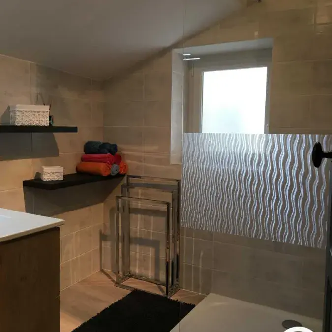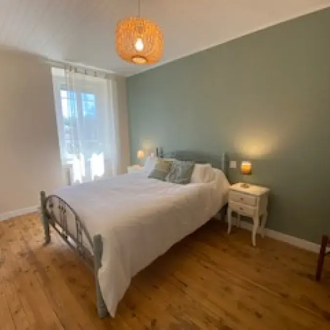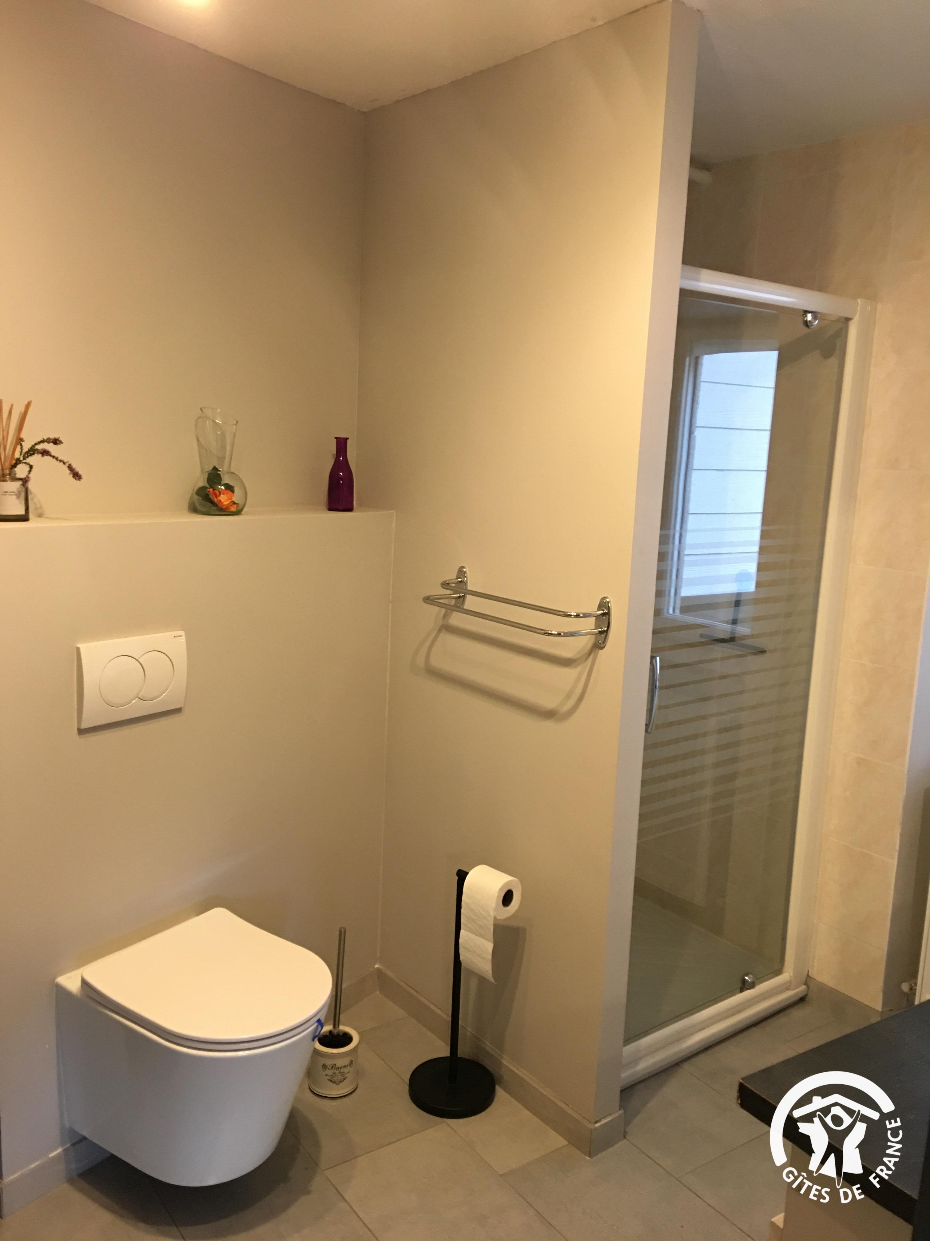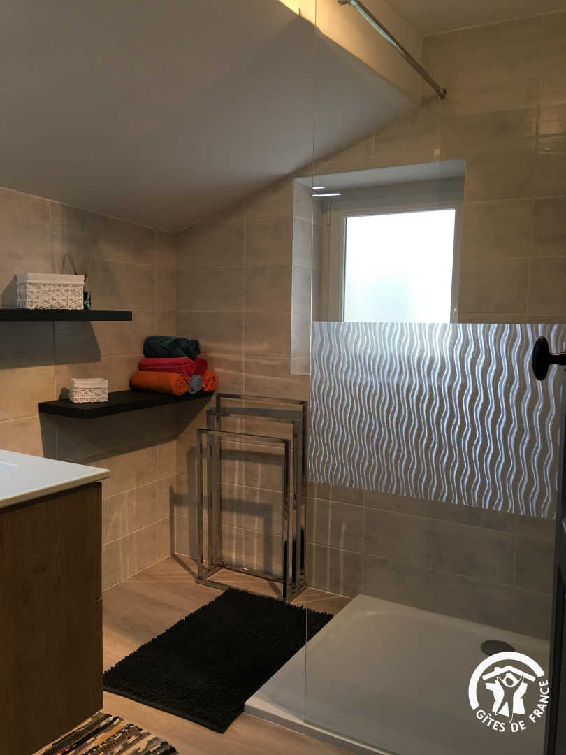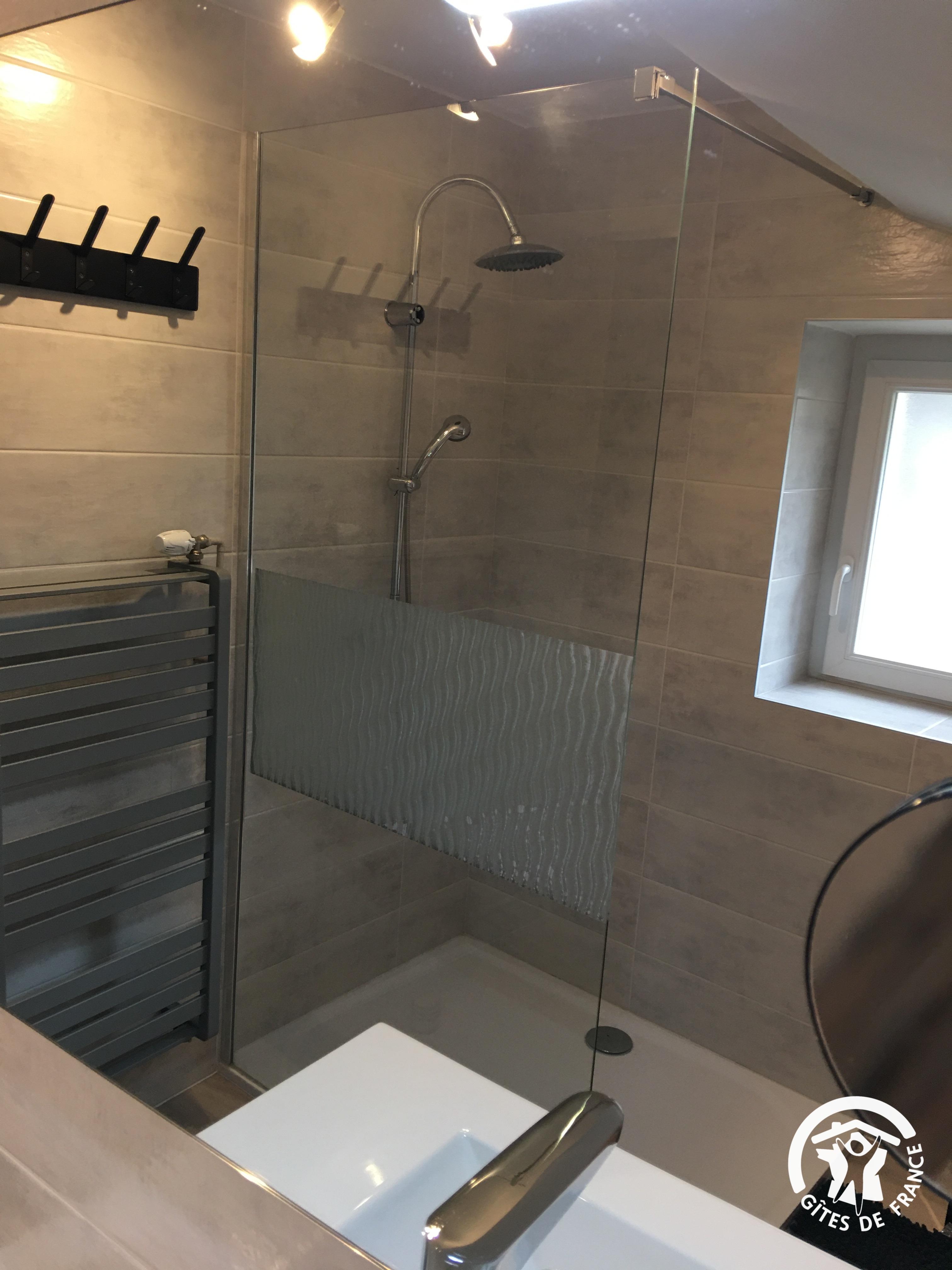 La maison mitoyenne à celle des propriétaire a été récemment rénovée pour offrir des espaces cosy et lumineux. Le logement se trouve en étage. Les escaliers extérieurs à côté du parking vous mènent directement dans l'espace salle à manger- cuisine. Bien agencée, celle-ci se dispose d'un réfrigérateur avec compartiment congélateur, de cafetières à filtre et nespresso, de mixer, robot de cuisine, autocuiseur, appareil à raclette, grille-pain, bouilloire... Le coin salon s'agence autour de la cheminée – insert. Sur ce palier, se trouve la première salle d'eau avec toilettes.