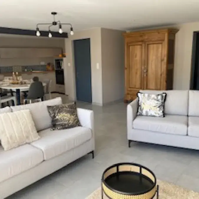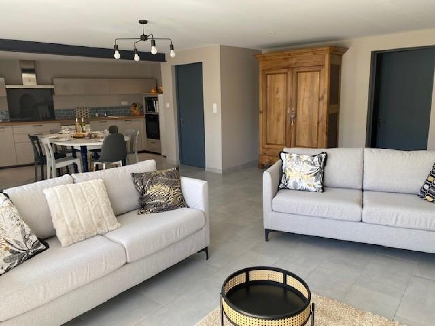 L'ensemble de la maison se démarque par une décoration chaleureuse et contemporaine. Les éléments en bois tels que le parquet de l'é