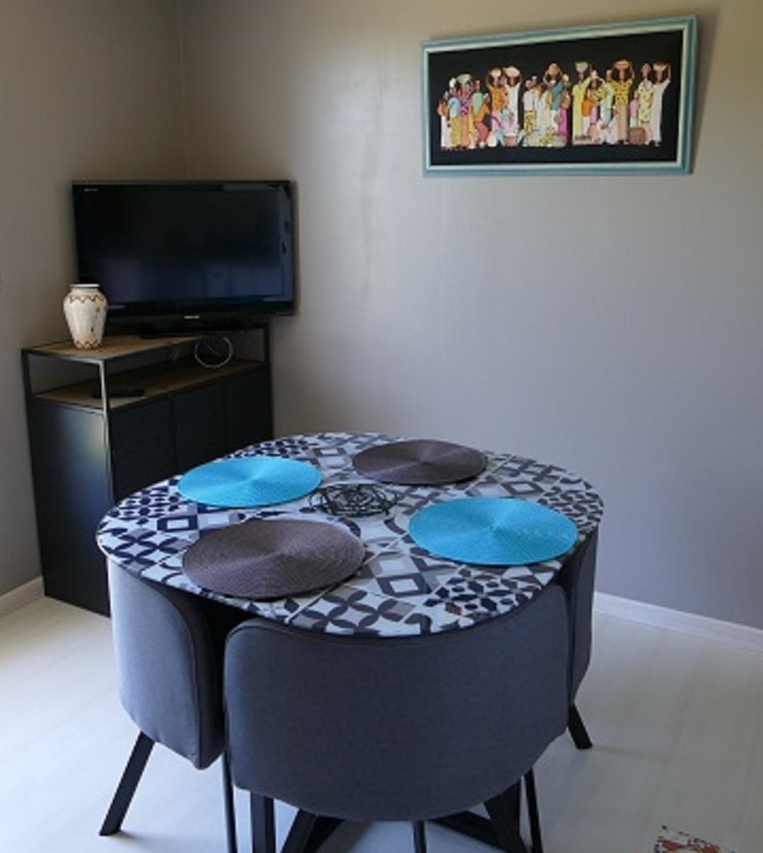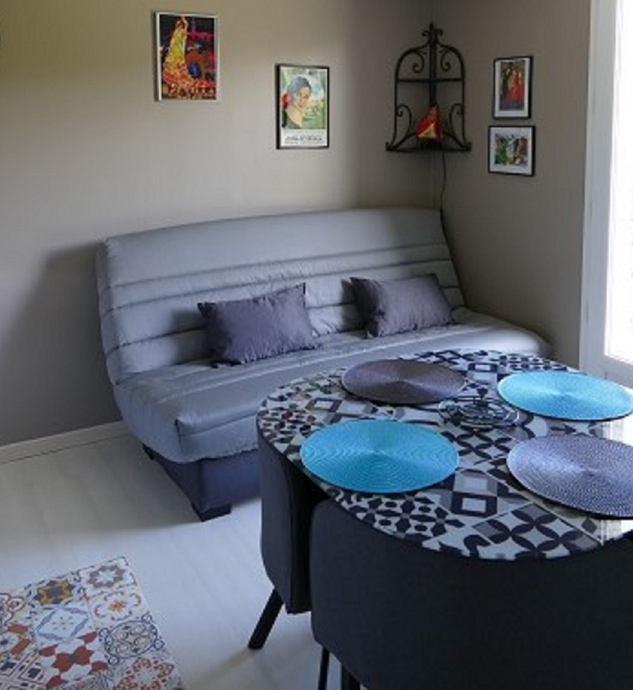 Coin salon avec canapé convertible, télévision, table et 4 chaises.