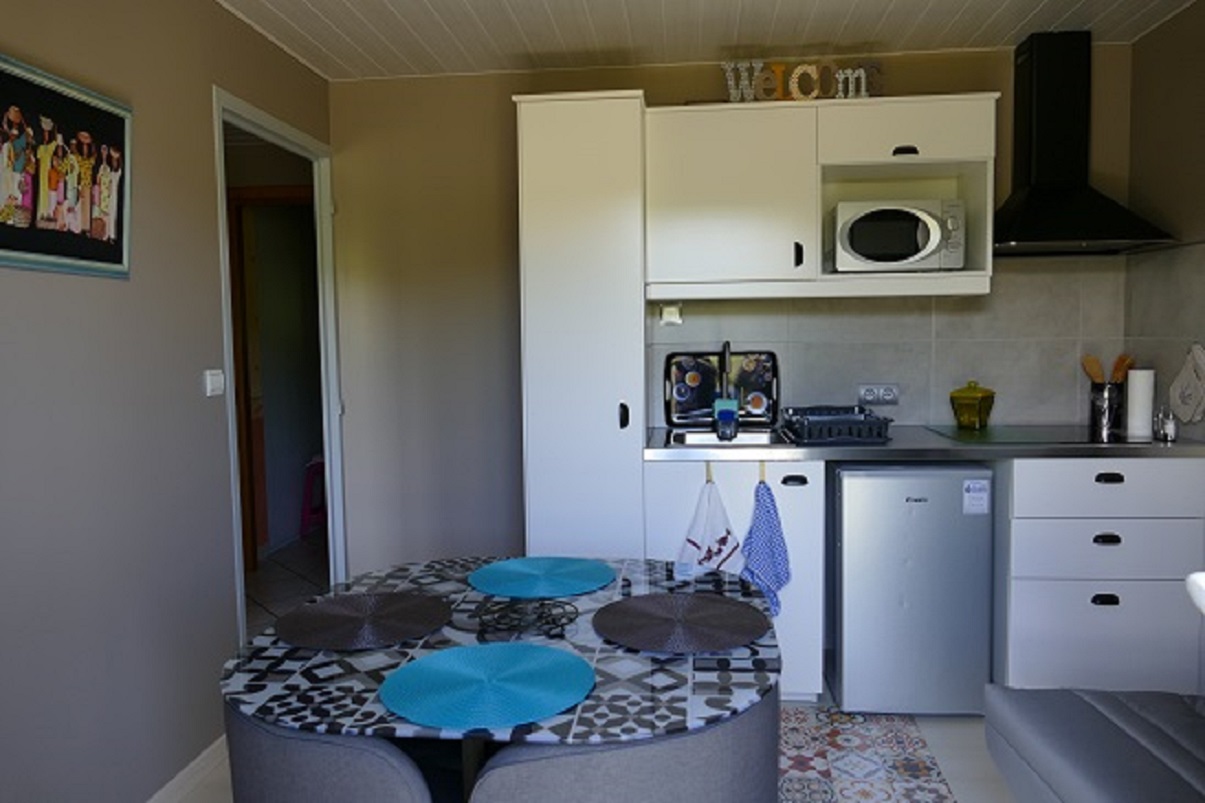 Appartement chauffé avec cuisine entièrement équipée (frigo, plaque vitrocéramique, vaisselle, produits d'entretien, étendoir à linge, fer et table à repasser).